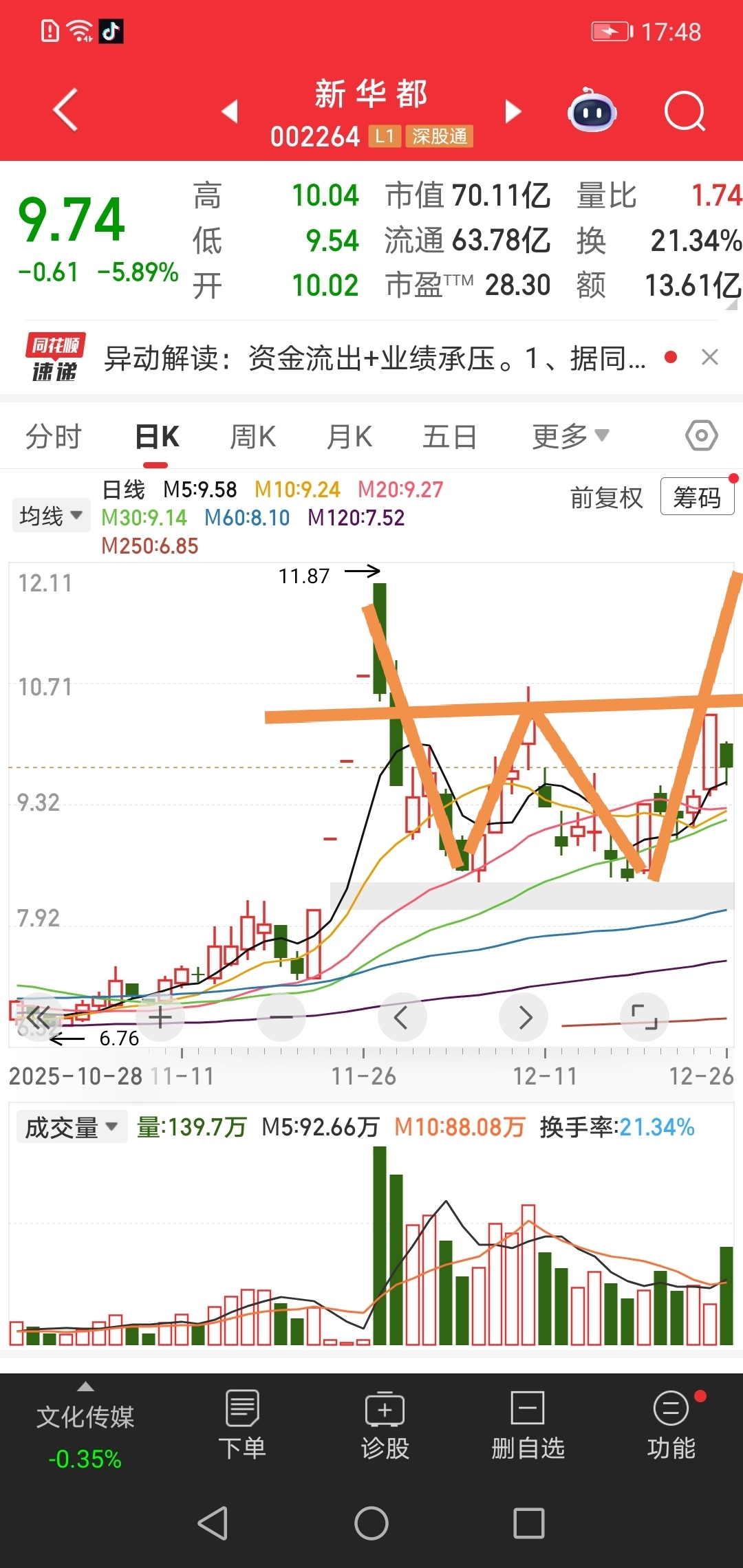 新华都“W”底之后的第一上涨目标:为颈线位+颈线到到与底的位置价差,颈线位在10