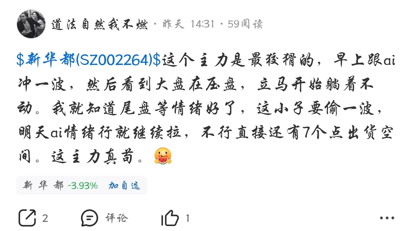 $新 华 都(SZ002264)$ 你就说准不准吧,早盘看ai不强,这主力立马横在7个点附近出货,哎。