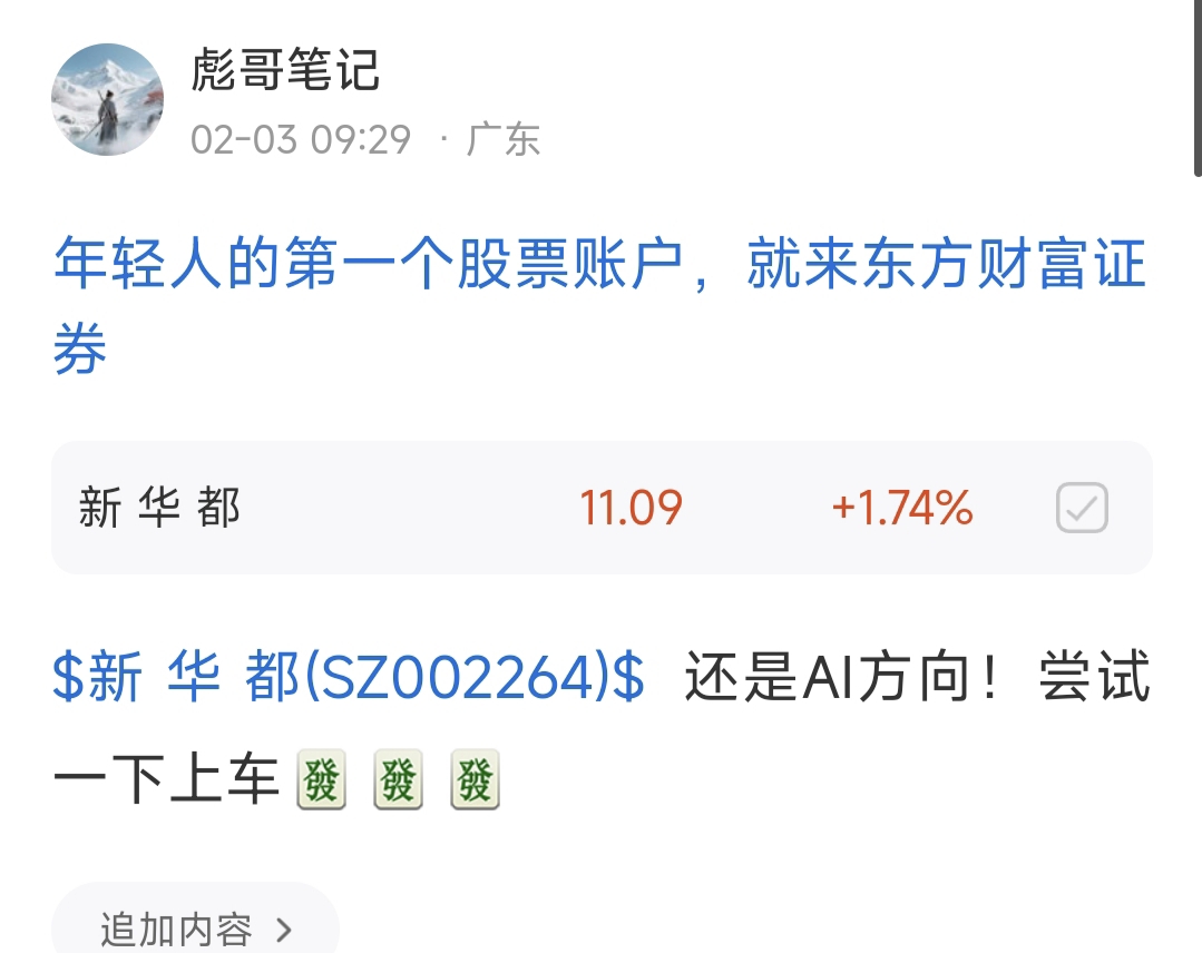 上车:$新 华 都(SZ002264)$ 继续干AI,昨日强势盘中涨停,成交上来了,今天高看一眼,就是干!