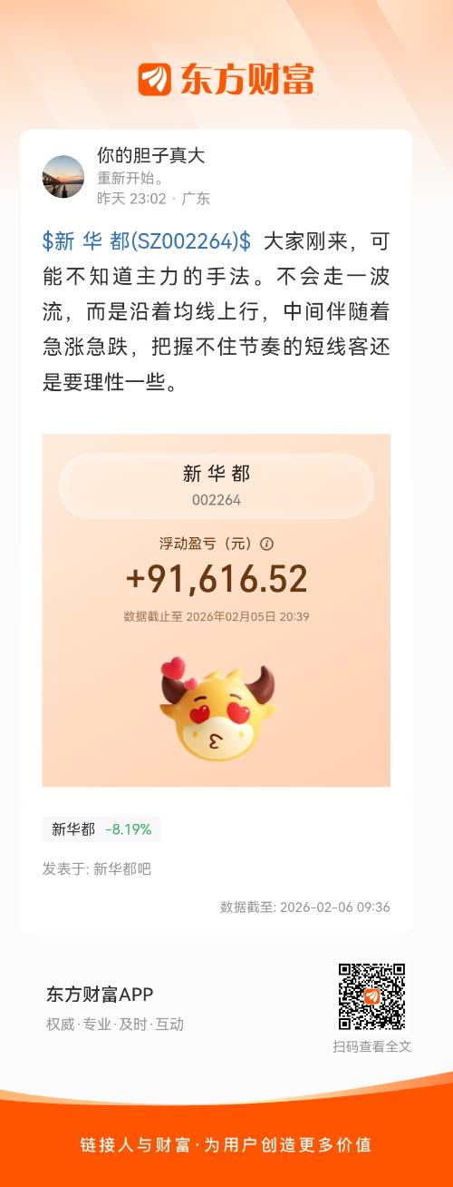 $新 华 都(SZ002264)$ 大家刚来,可能不知道主力的手法。不会走一波流,而是沿着均线上行,中间伴随着急涨急跌,把握不住节奏的短线客还是要理性一些。