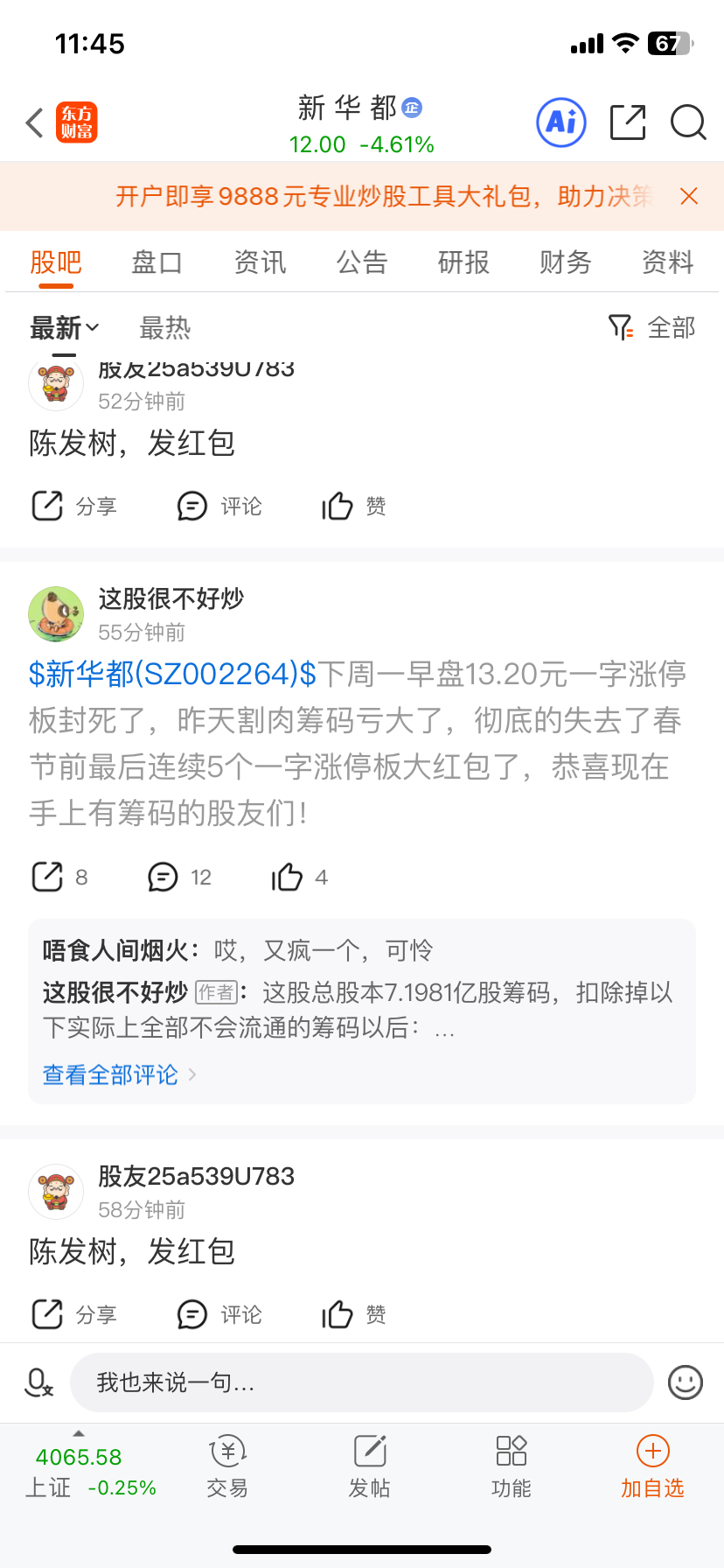 $新 华 都(SZ002264)$ 大家合起伙来整治一下市场乱象,愿意出力的就举报投诉一下,此人要么就是后台有操控,要么就是亏空了,建议大家出手举报一下