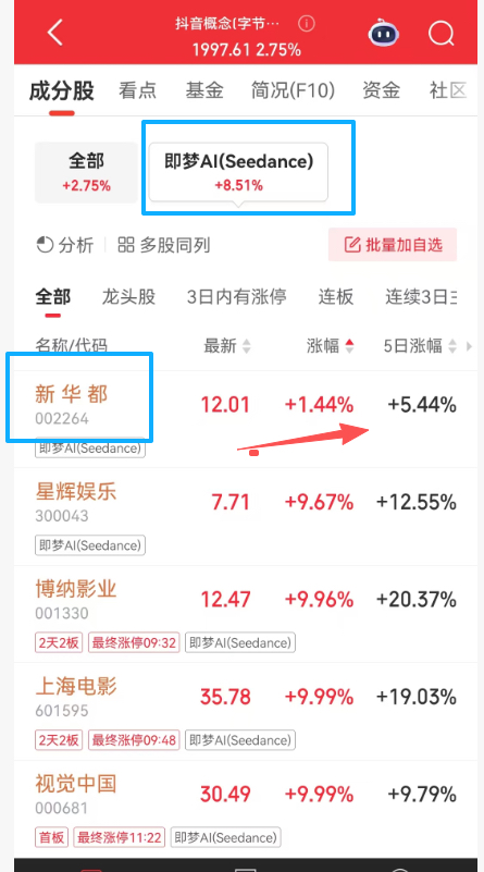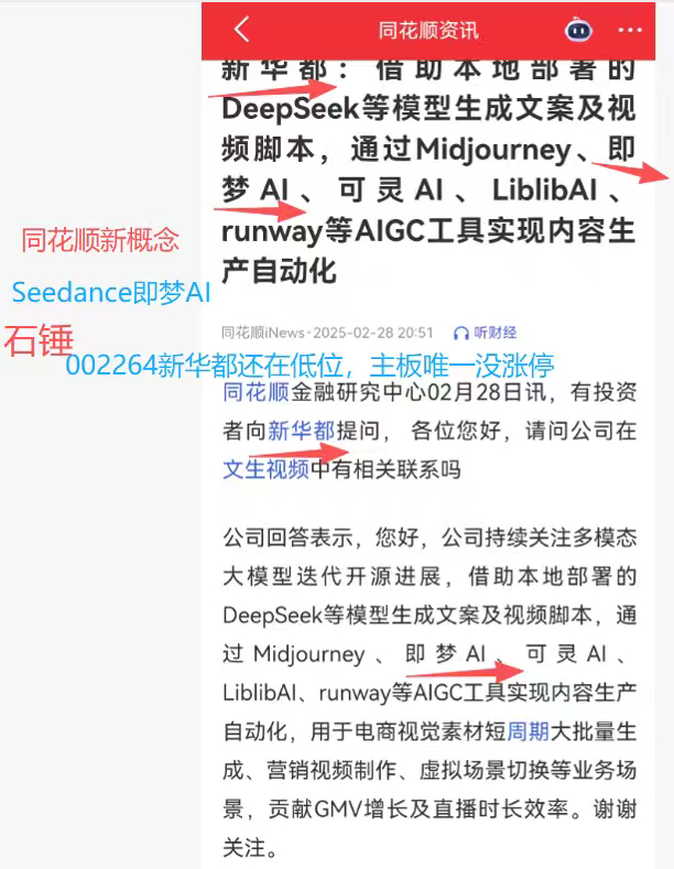 同花顺新概念即梦AI,同板块其他主板票都是涨停,新华都石锤Seedance即梦A