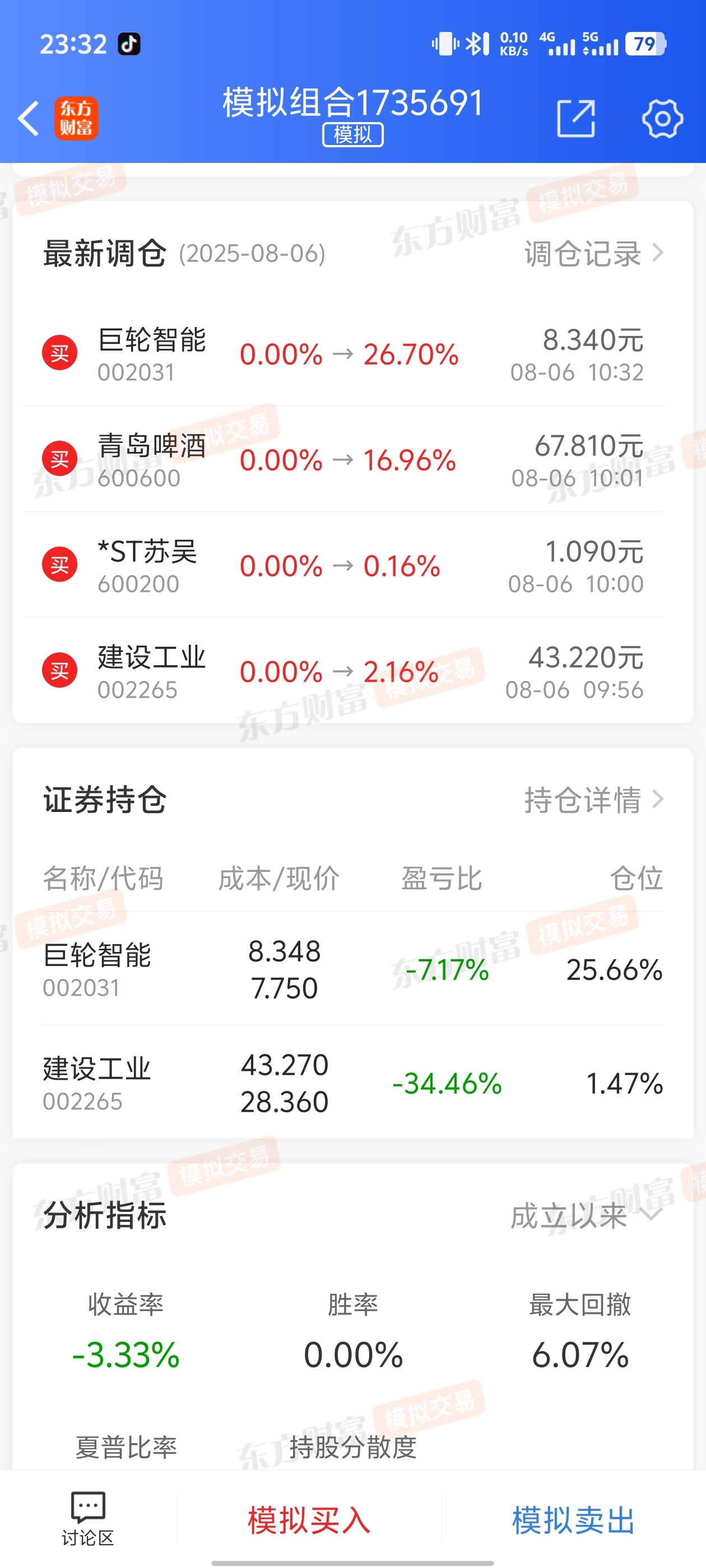$建设工业(SZ002265)$ 模拟,亏了34个点。