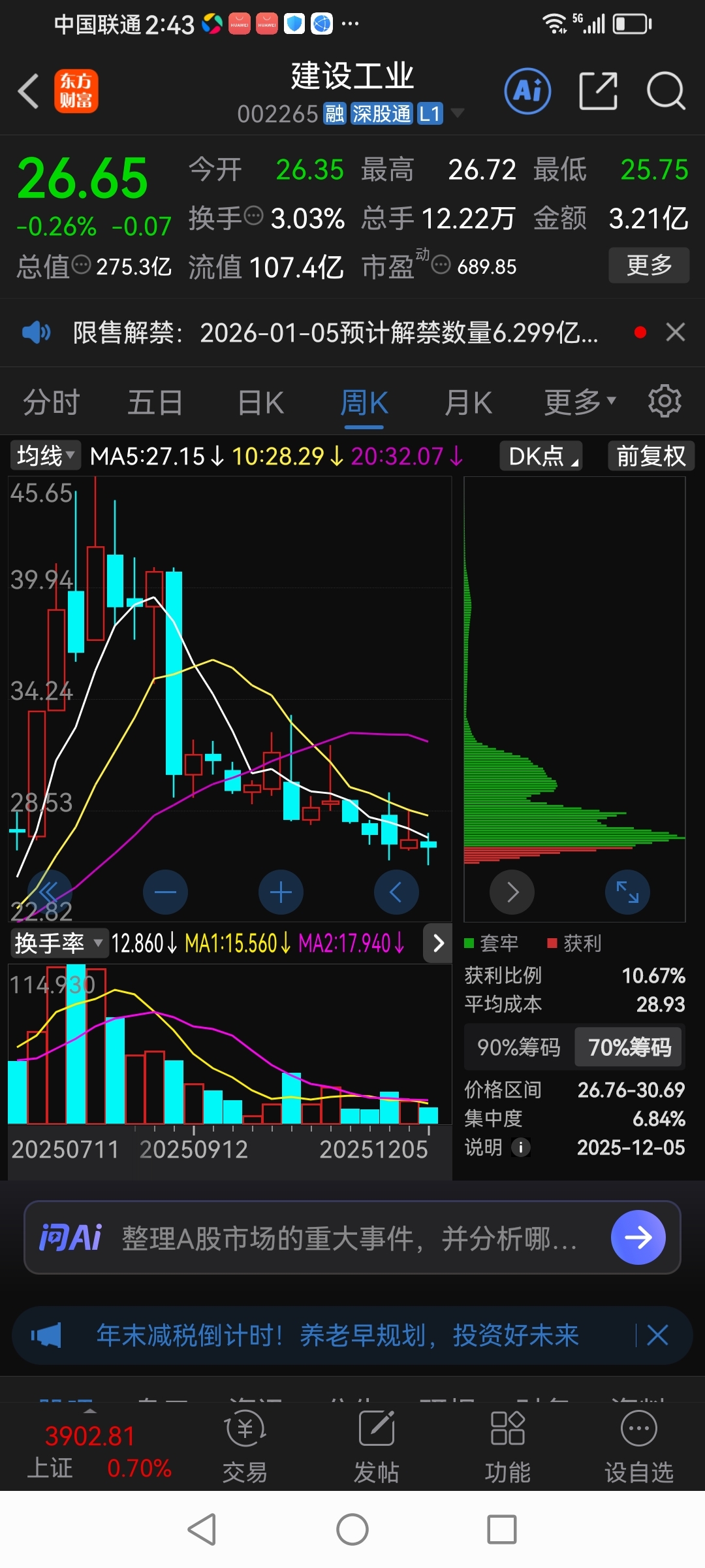 $建设工业(SZ002265)$ 今日复盘看哭了,作为一个20年老股民为什么相信朋友9月3号说这个票好我进去了,一直跌一直补仓,现在不知道怎么样从40元跌到26元跌傻了,知道主力已经出完货了但是自己又可以怎样有时候上头了下跌过程又不舍得割,在军工航天航空这样拉地面兵装中选一建设工业,我觉得我属于担心怕死这种性格表现的淋漓尽致。好在没有加杠杆杠杆,不然的话死的更快。大佬们我还能不能坚持,快腰斩了