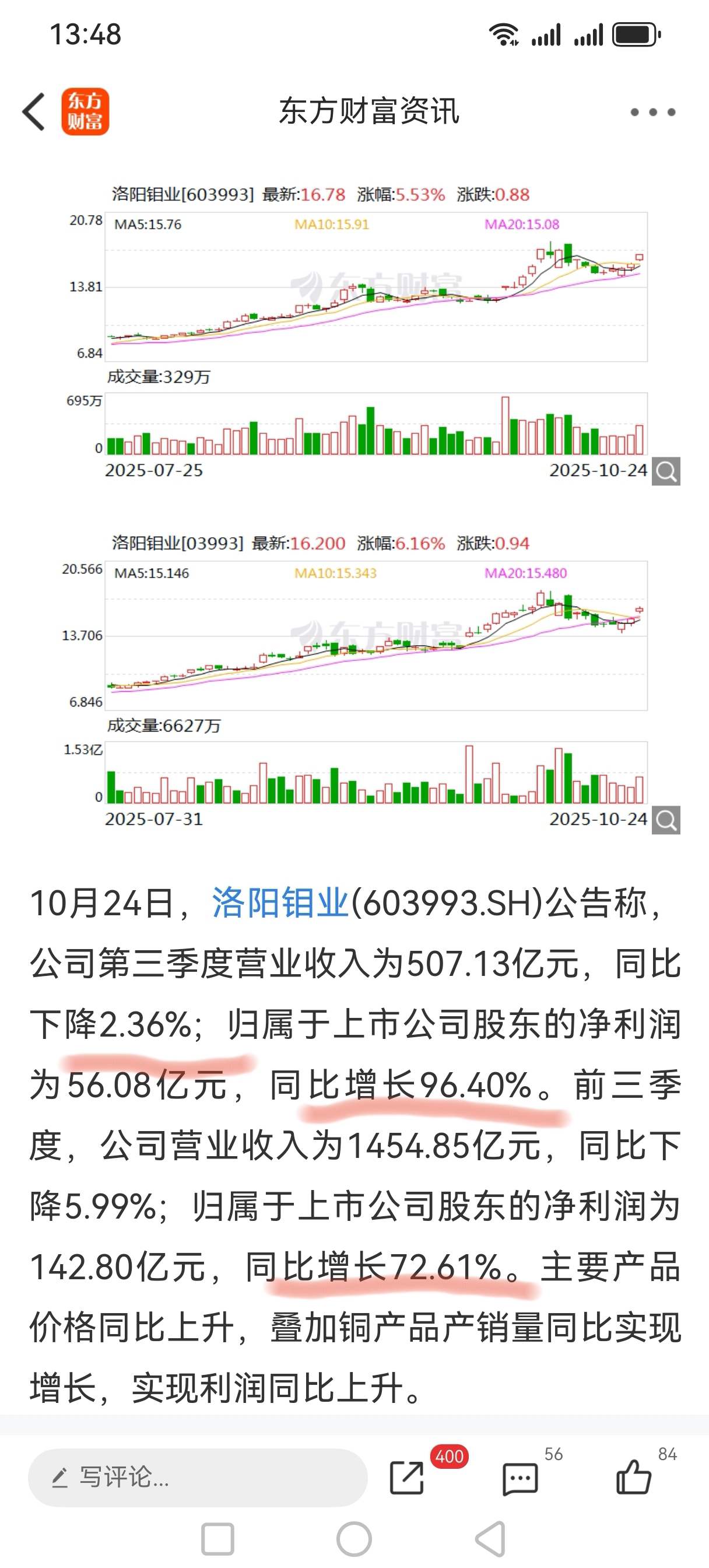 $浙富控股(SZ002266)$ 参考洛阳钼业三季报,以及董秘回复的铜价上涨对公司业绩产生积极影响得出,浙富增利不增收。三季报业绩增长20个点左右,四季报增长100个点左右