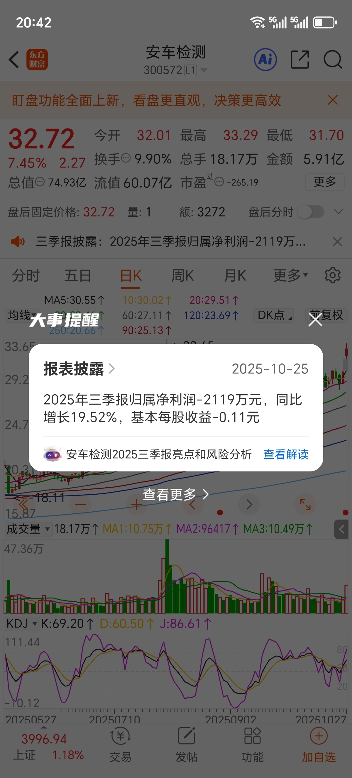 安车检测三季度亏了两千多万,今天开盘涨了七个多点