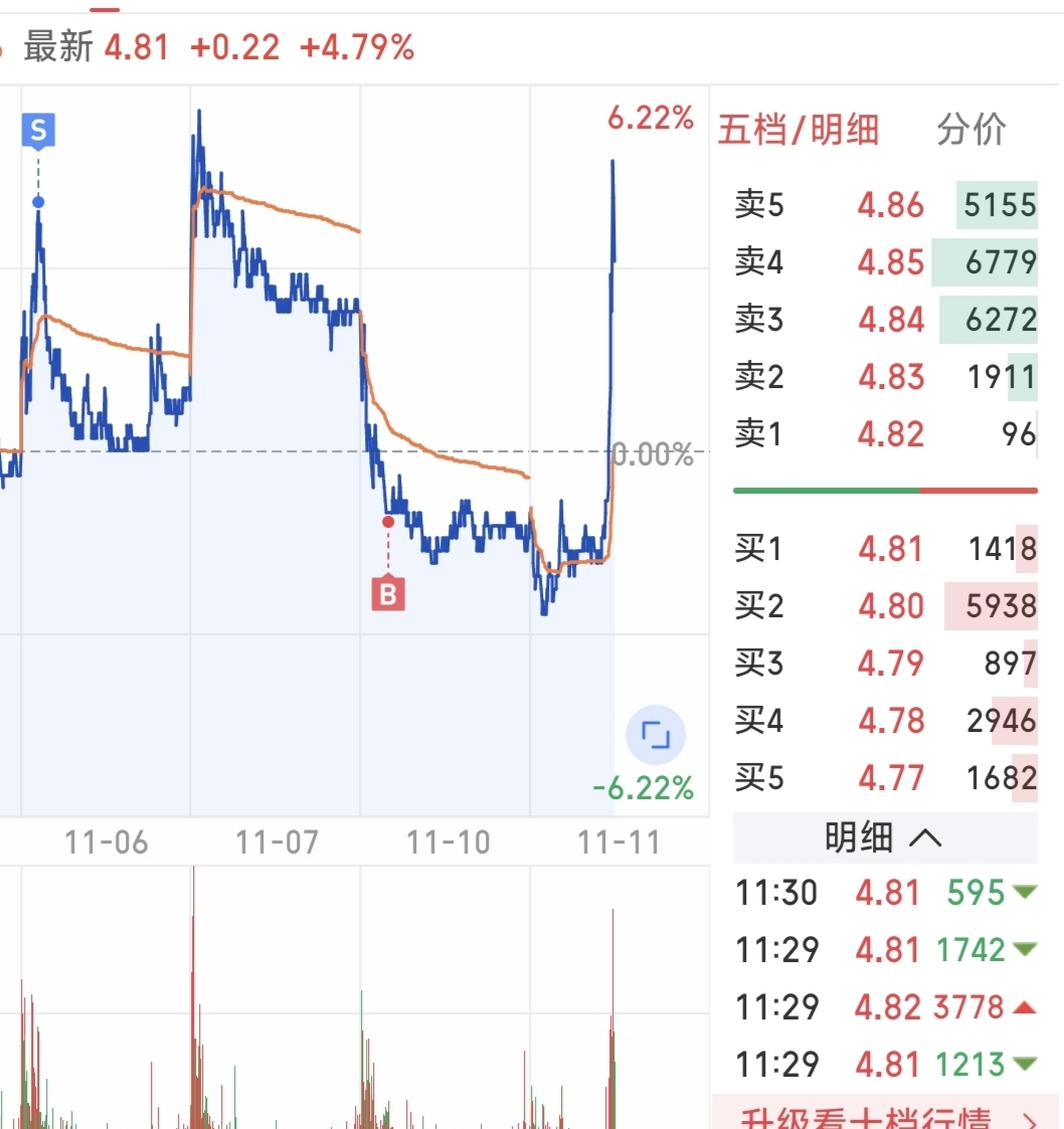 一上午没看盘吃亏了,卖不动最高点了,这里是反弹不是反转。这里用4000多万拉5个点,是给前面追高的解套的,短期应该就这一次机会。前面我预计这现象在周一会发生,没想到拖到了周二。所以昨天我买入了一份坐等这5个点。后面走势,极大概率走阴跌震荡,时不时小拉下,不管怎么走,短期我看会碰4.4的缺口。