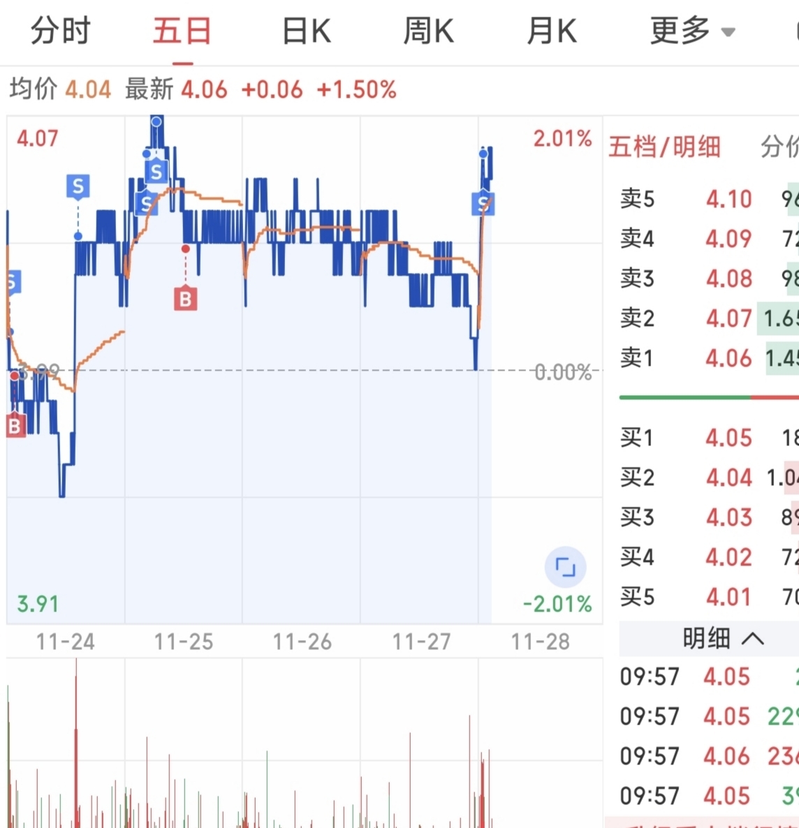 4.06先出局了,坐等反t,这里还会震荡磨底,一下子拉上去的概率很小,预计今天收盘价格4.03吧
