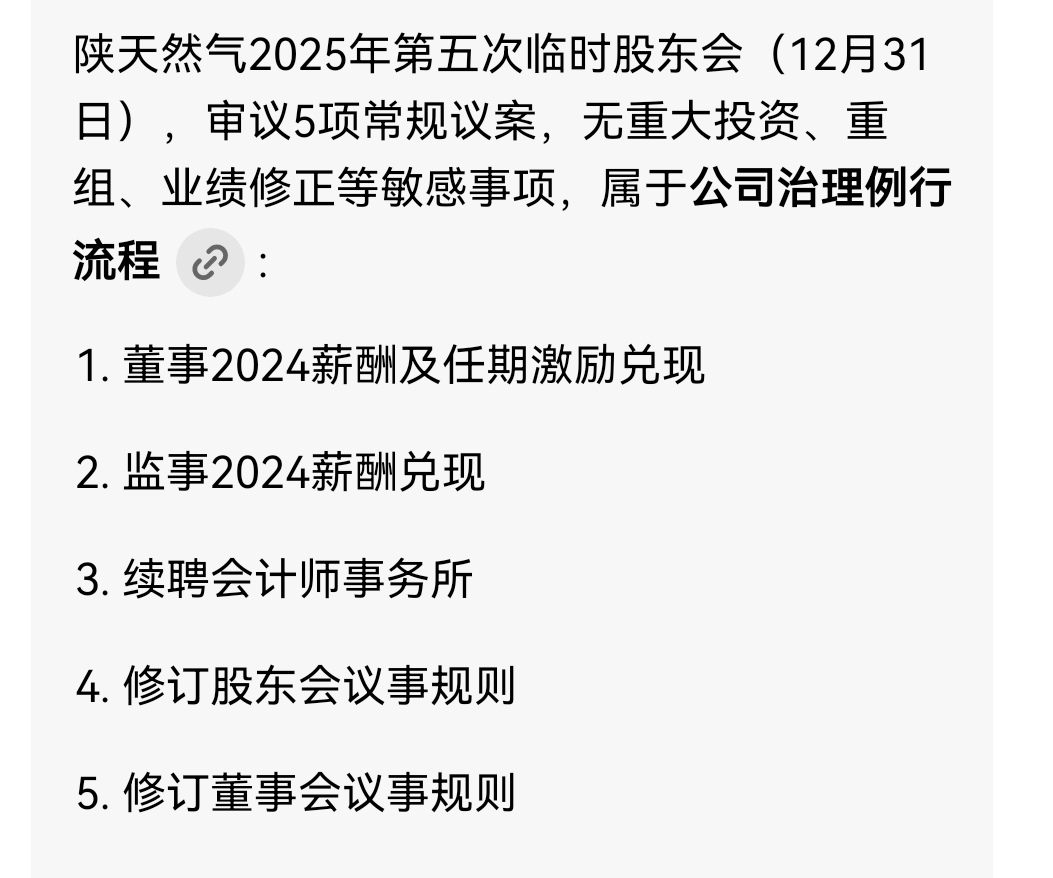 问了豆包才明白,陕天然气又是临时股东大会又是公告的,主要目的就是给管理层发钱!业