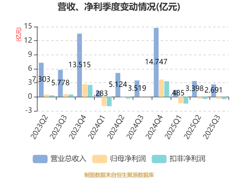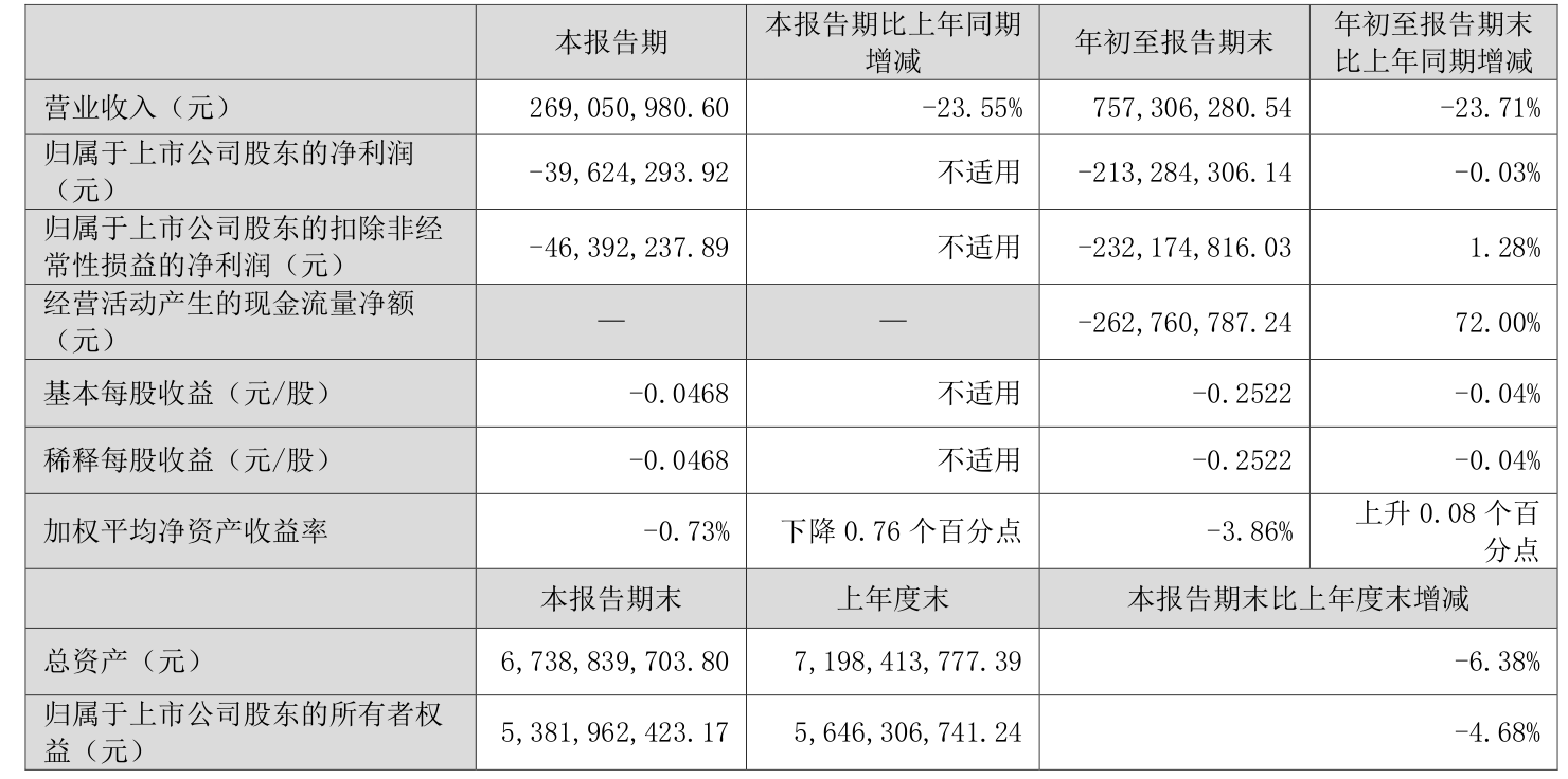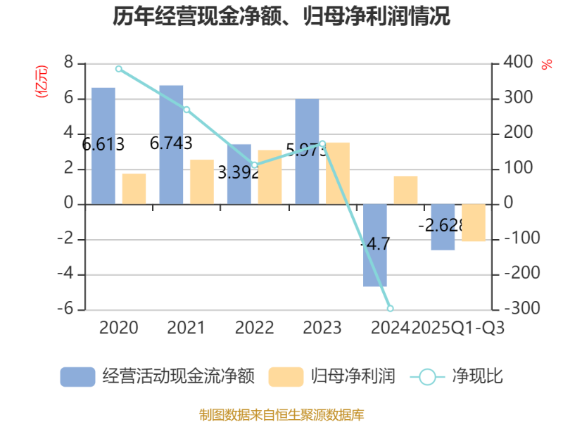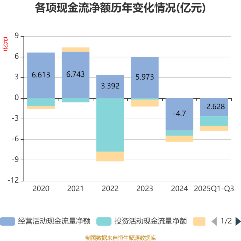 2025年前三季度,公司经营活动现金流净额为-2.63亿元,同比增加6.76亿元;筹资活动现金流净额-7273.76万元,同比增加1215.39万元;投资活动现金流净额-1.39亿元,上年同期为-5719.93万元。