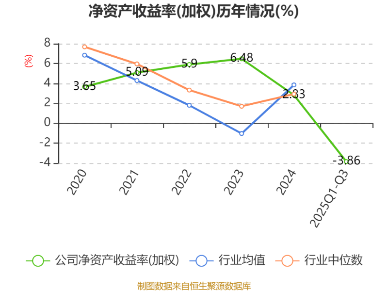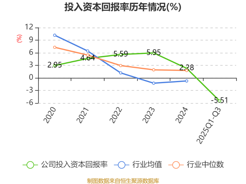 盈利能力方面, 2025年前三季度公司加权平均净资产收益率为-3.86%,同比上升0.08个百分点。公司2025年前三季度投入资本回报率为-5.51%,较上年同期上升0.58个百分点。