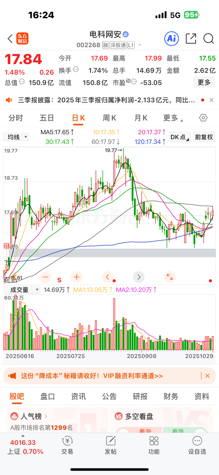 $电科网安(SZ002268)$ 想当初19块女朋友叫我卖了换钱带她去三亚,我不卖,现在女朋友跟别人去三亚了