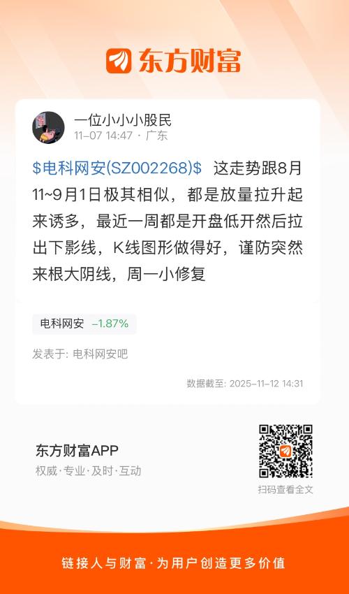 $电科网安(SZ002268)$ 这走势跟8月11~9月1日极其相似,都是放量拉升起来诱多,最近一周都是开盘低开然后拉出下影线,K线图形做得好,谨防突然来根大阴线,周一小修复