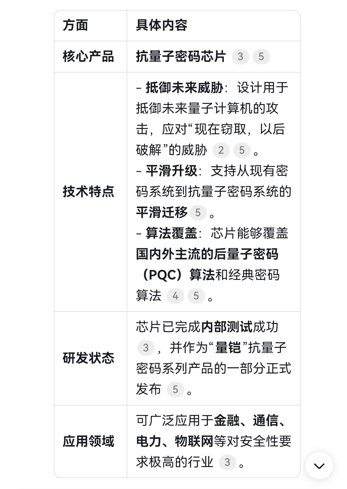 其研发的"量铠"抗量子密码芯片是核心成果之一。该芯片采用算法可重构+专用处理器双轨设计,支持NIST标准算法、国密验证算法及定制算法。它具备从硬件到固件的多重防护设计,能以每秒数千次的速度完成密钥生成、加密、签名等运算,可满足金融交易、电力调度等高实时性场景需求。