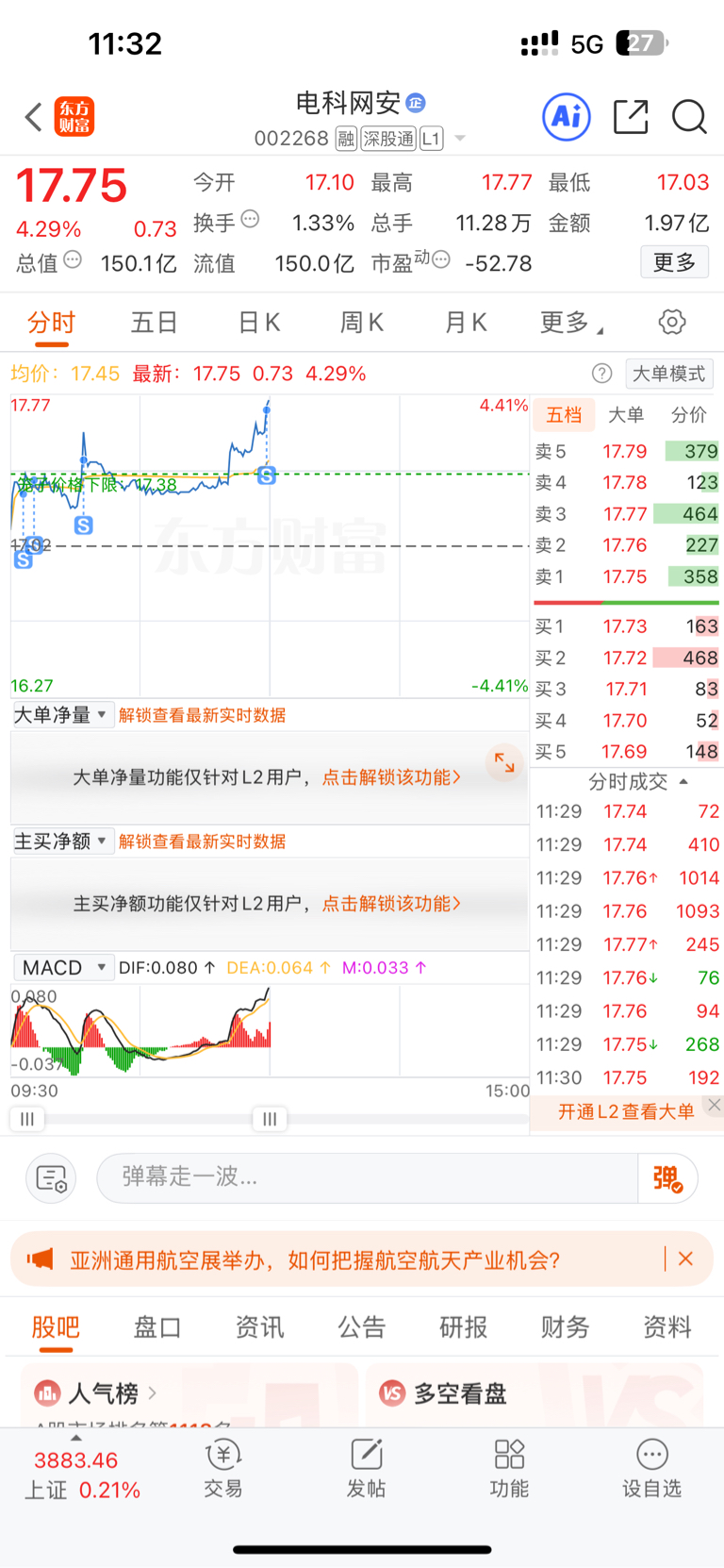 $电科网安(SZ002268)$ 快拉升,我给你派筹码