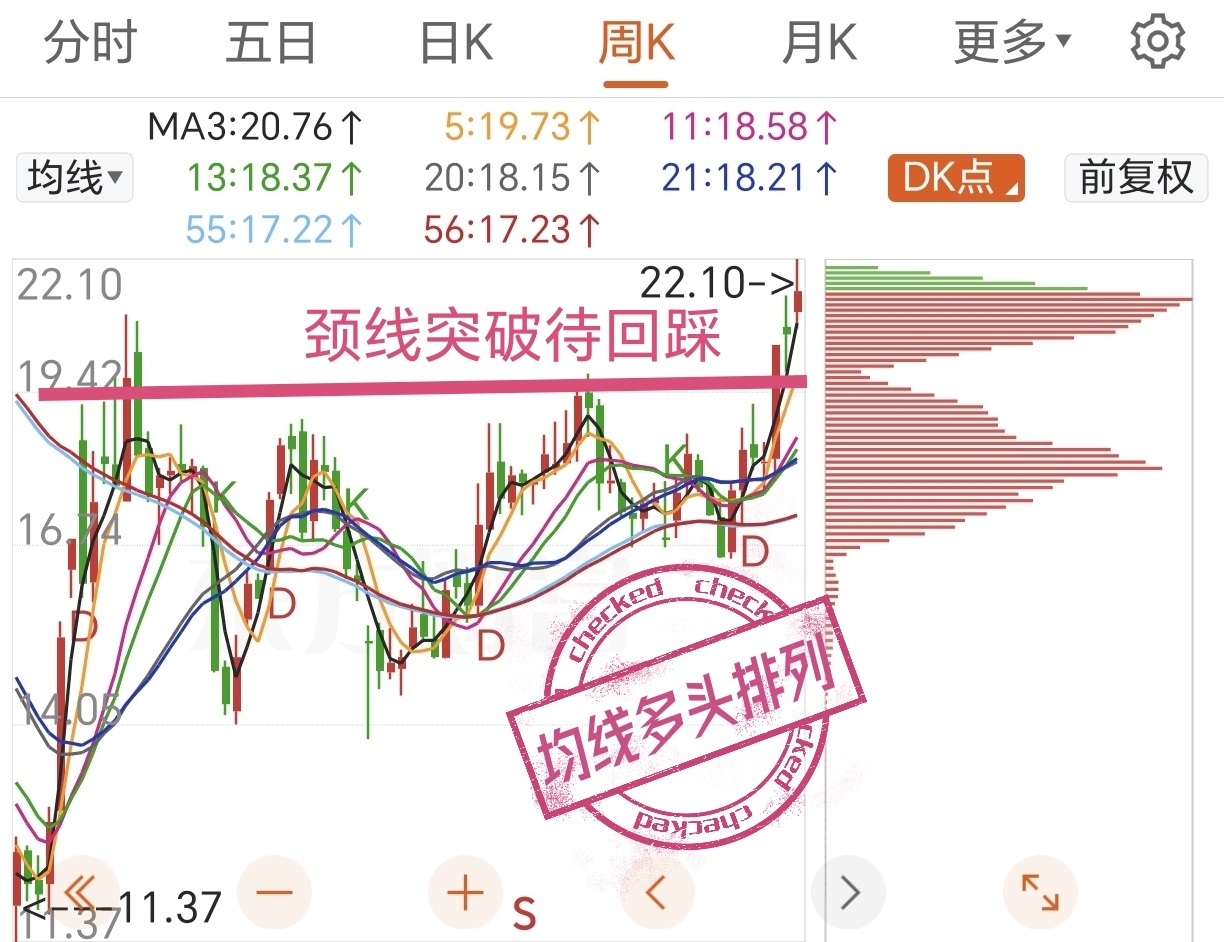 (周线图)颈线突破待回踩(日线缺口待回补)希望给二次上车机会。