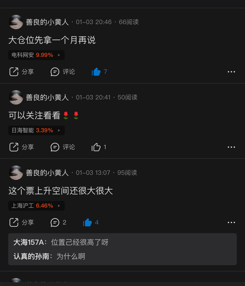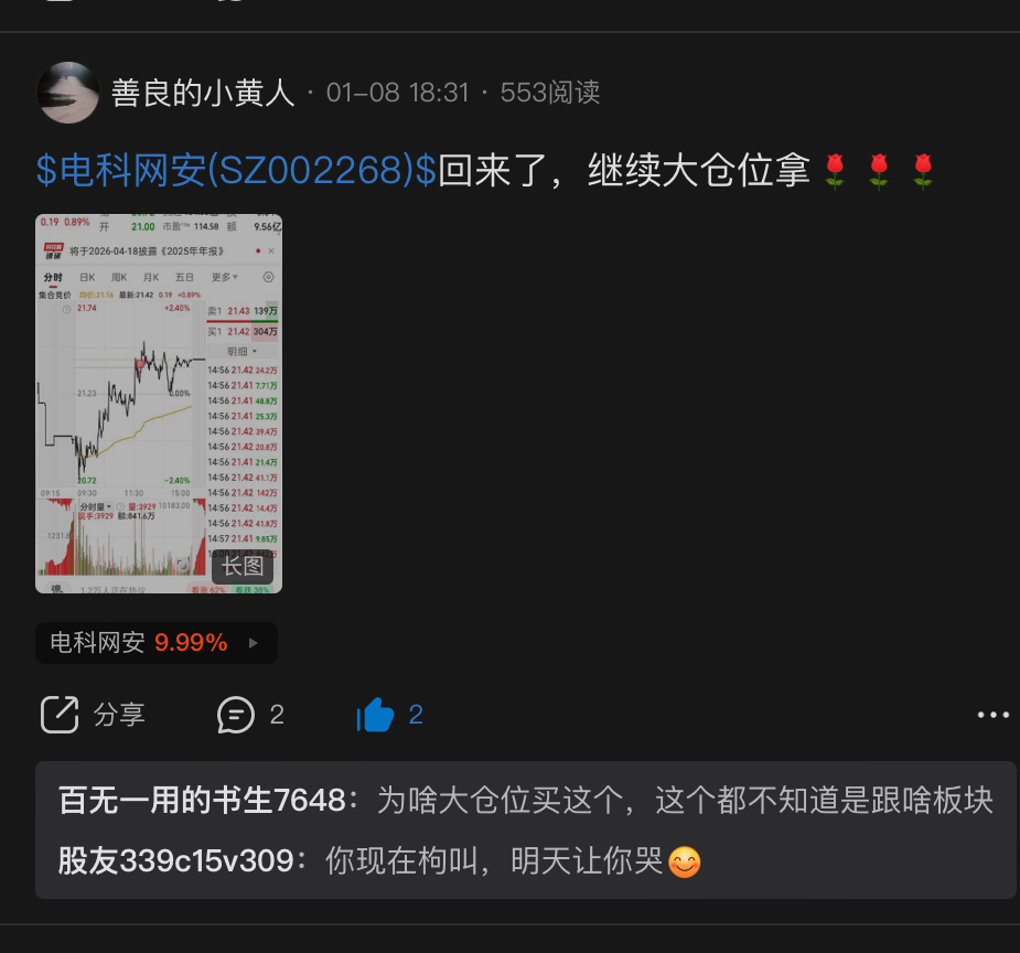 温馨提示: 1.根据《证券法》规定,禁止编造、传播虚假信息或者误导性信息,扰乱证券市场;2.用户在本社区发表的所有资料、言论等仅代表个人观点,与本网站立场无关,不对您构成任何投资建议。用户应基于自己的独立判断,自行决定证券投资并承担相应风险。《东方财富社区管理规定》