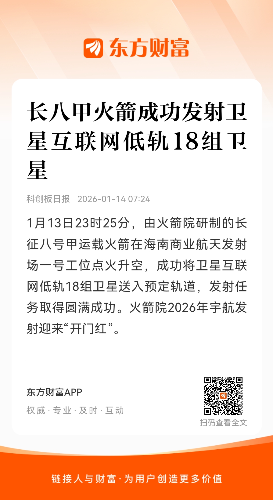 1月13日23时25分,由火箭院研制的长征八号甲运载火箭在海南商业航天发射场一号工位点火升空,成功将卫星互联网低轨18组卫星送入预定轨道,发射任务取得圆满成功。火箭院2026年宇航发射迎来“开门红”。