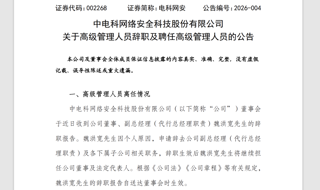 微成都报道1月26日,电科网安(002268.SZ)发布公告称,魏洪宽因个人原因,申请辞去公司副总经理(代行总经理职责)及各下属子公司相关职务,辞职生效后魏洪宽将继续担任公司董事及法定代表人。