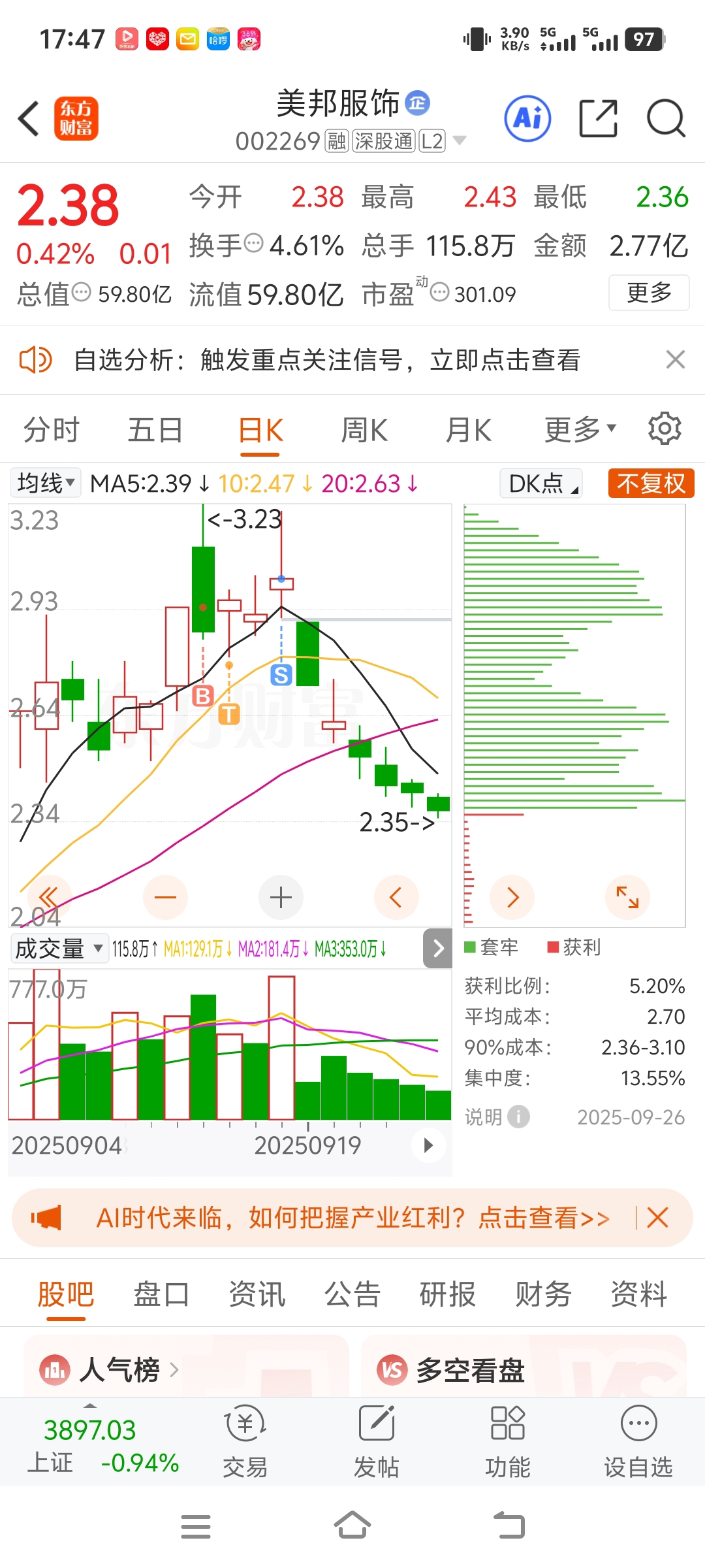 $美邦服饰(SZ002269)$ 我这算逃顶吗