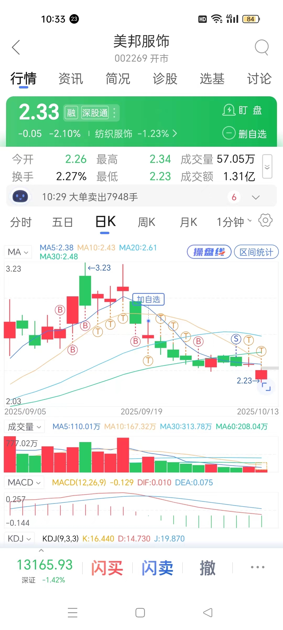 $美邦服饰(SZ002269)$ 我两成仓做t,结果踢来踢去还踢的亏了0.8,