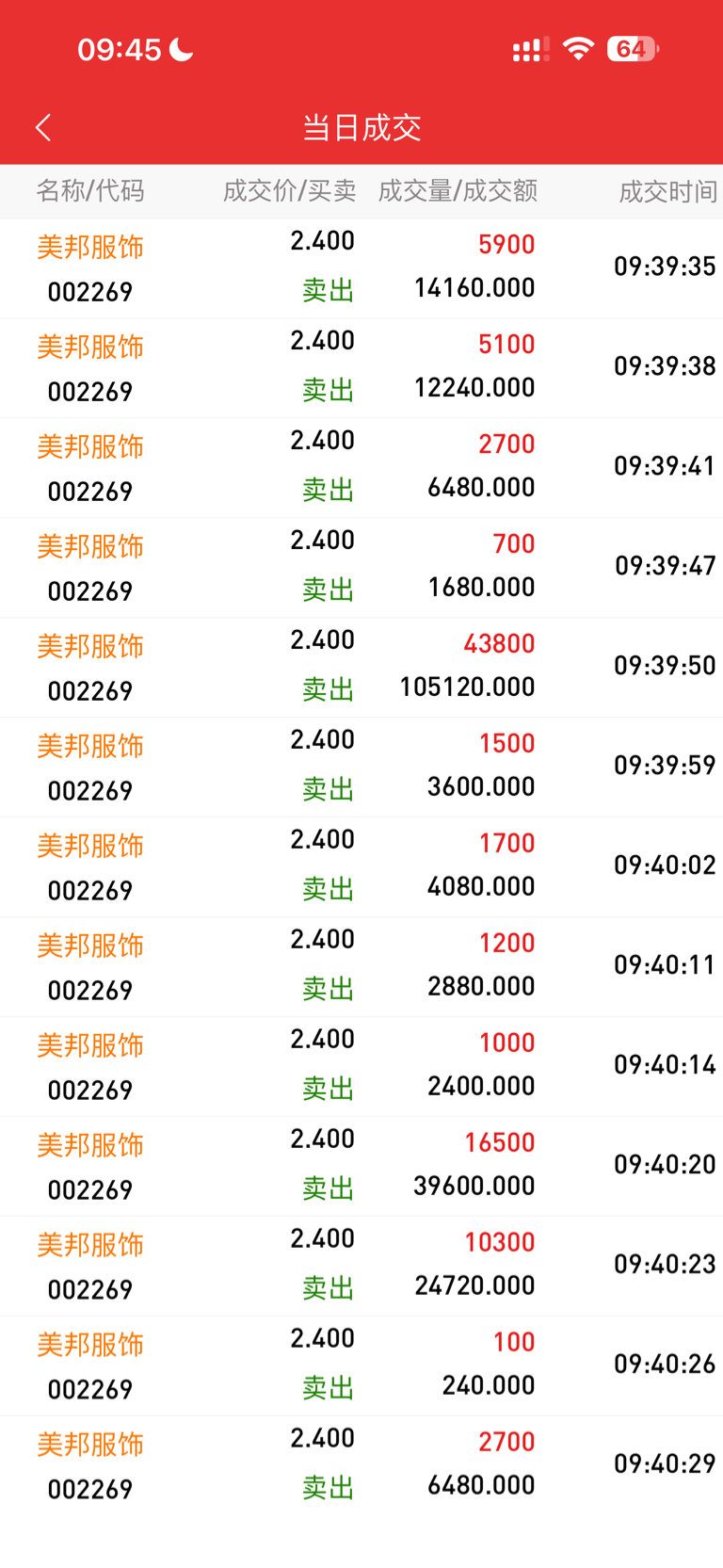 $美邦服饰(SZ002269)$ 2.38,465400股,2.40我跑了,不敢跟你们玩了…庄家感谢不套之恩!