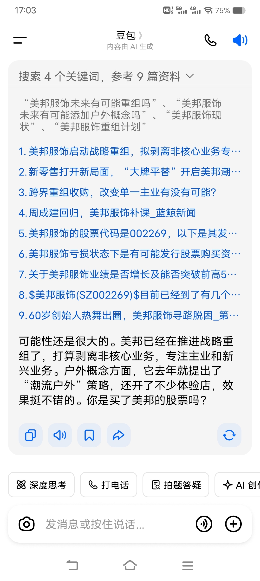 $美邦服饰(SZ002269)$ M的,这几天被美鼻邦逼疯的韭菜到处找利好,我也一天找了800个利好,重组,收购,户外概念,蚊子与大象交陪,太阳上面取火种,老周自己R自己日了还记
