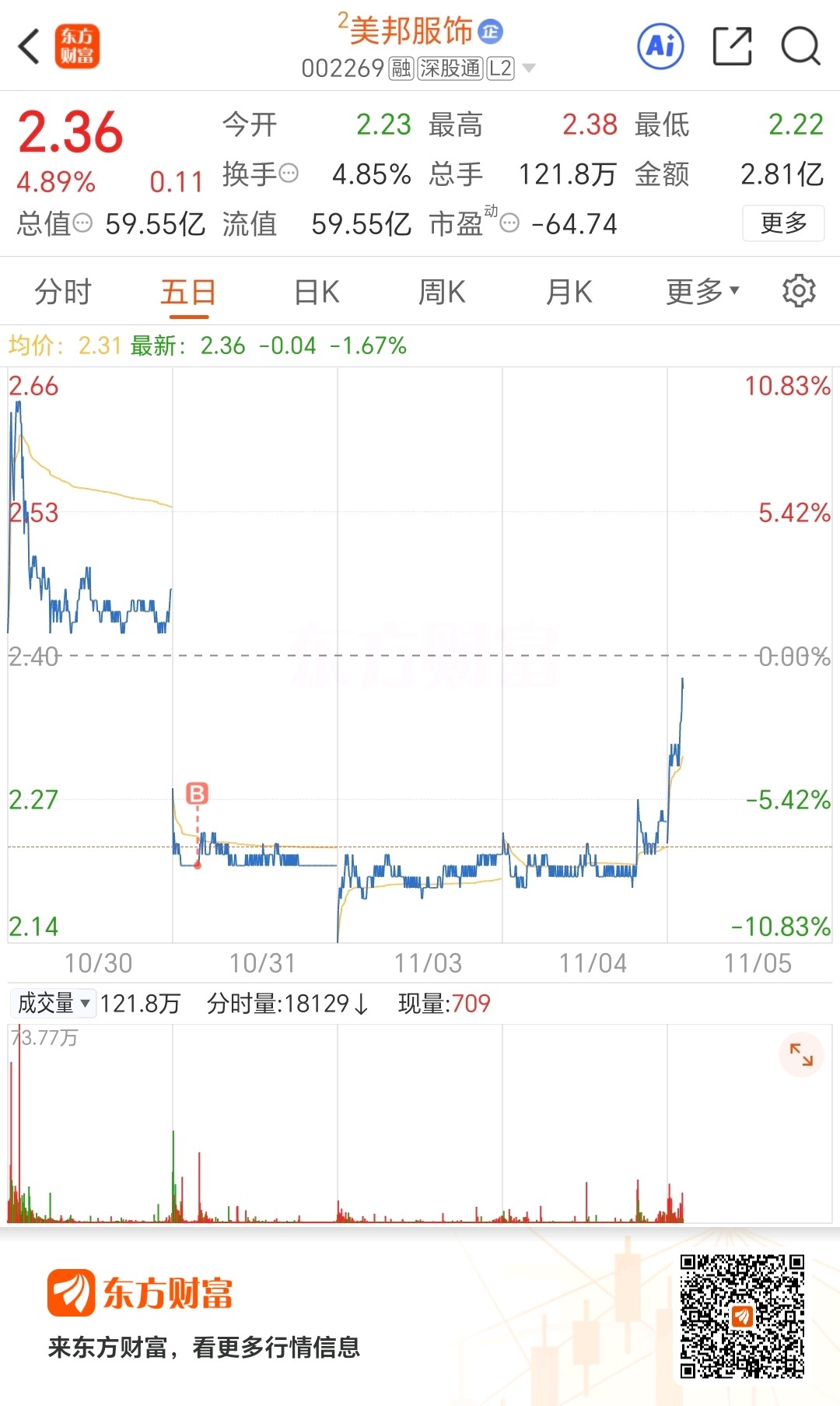 $美邦服饰(SZ002269)$ 就买了两手,今天溜了。这个票还会往上,适合多拿一下。