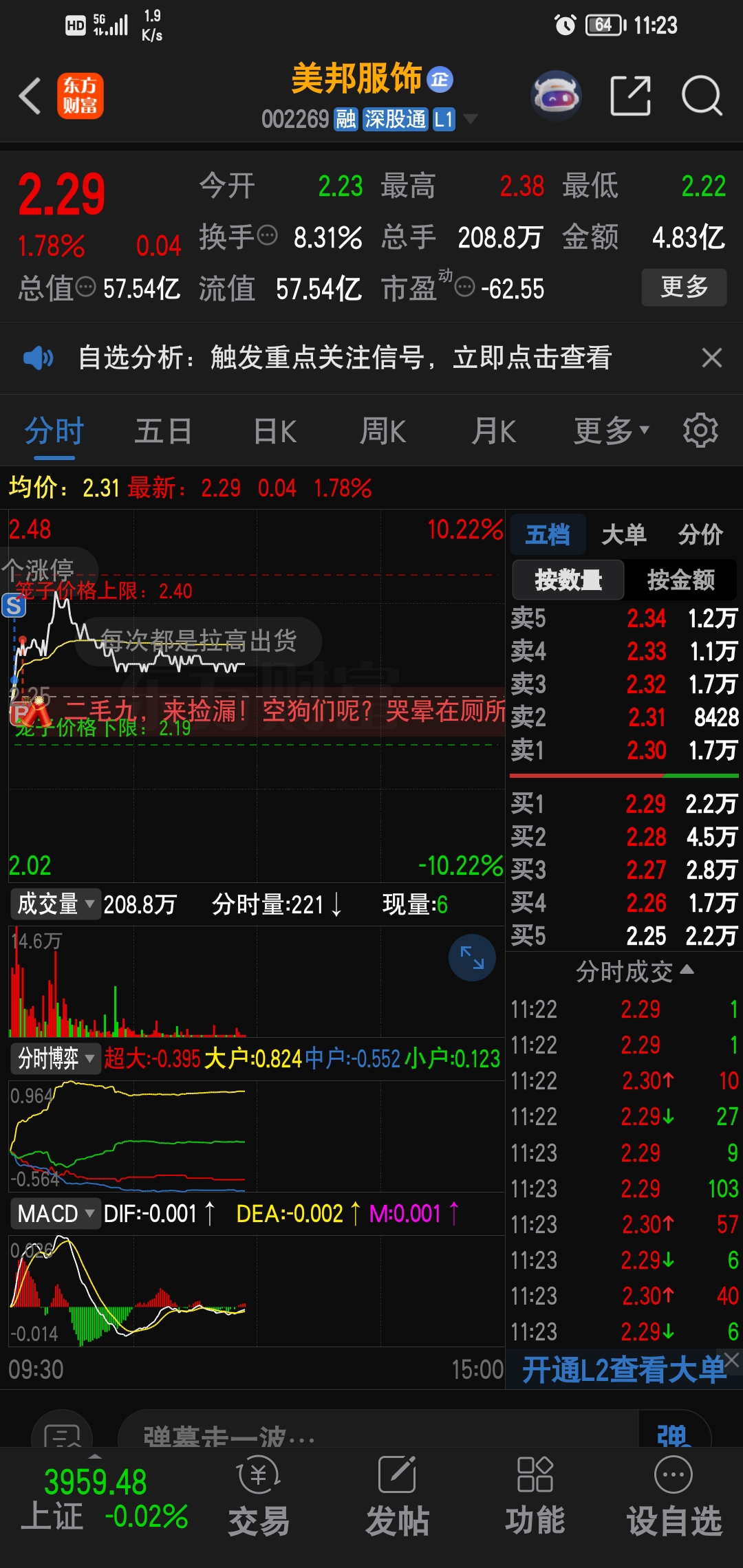 $美邦服饰(SZ002269)$ 收2.31才不亏钱,干得啥事,卖飞就卖飞不追还好,3.76本想追去山子,最后犹豫了又怕卖飞,追回美邦!今天干啥都没心情了!