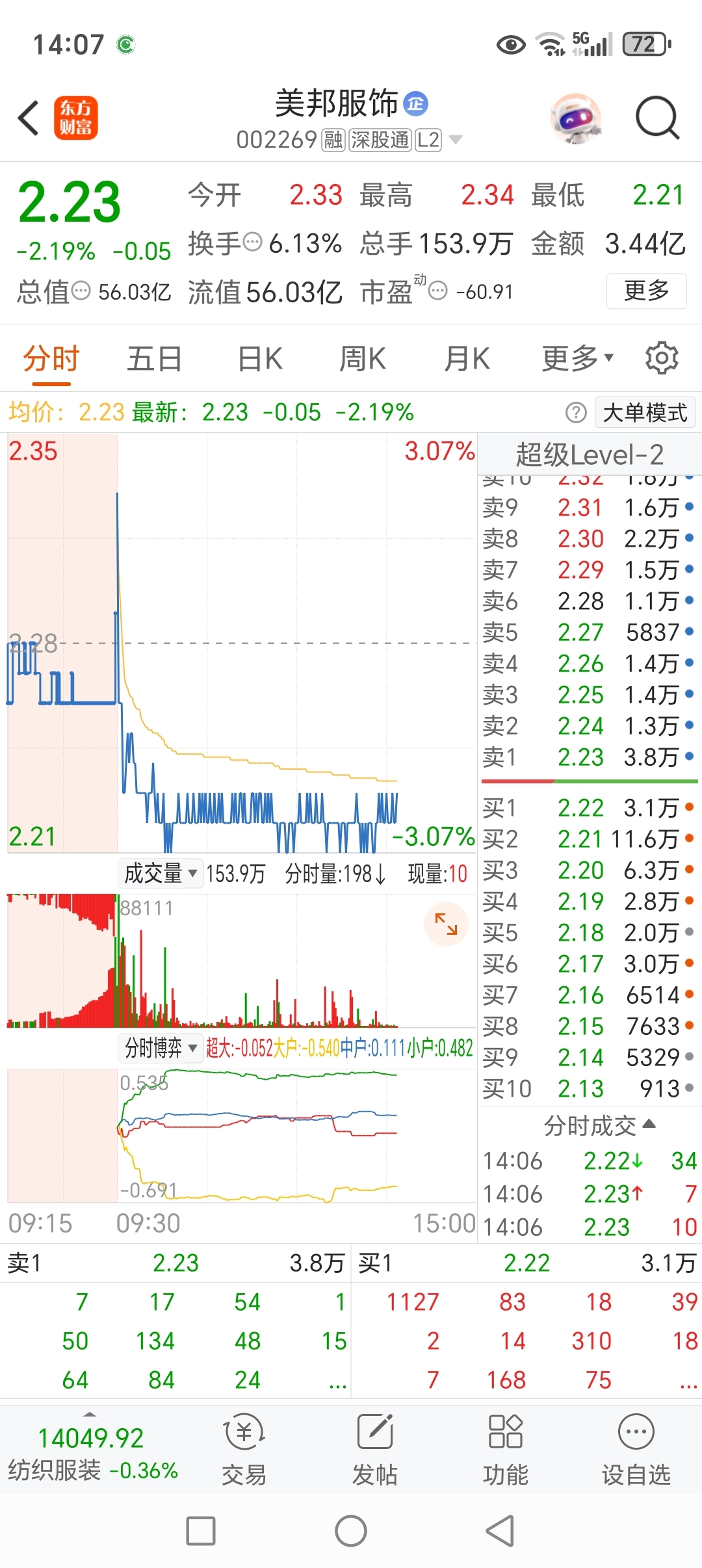 $美邦服饰(SZ002269)$ 看看分时博弈里,小户线在上,其他线在下,就说明散户在买,主力在出,没个涨上去