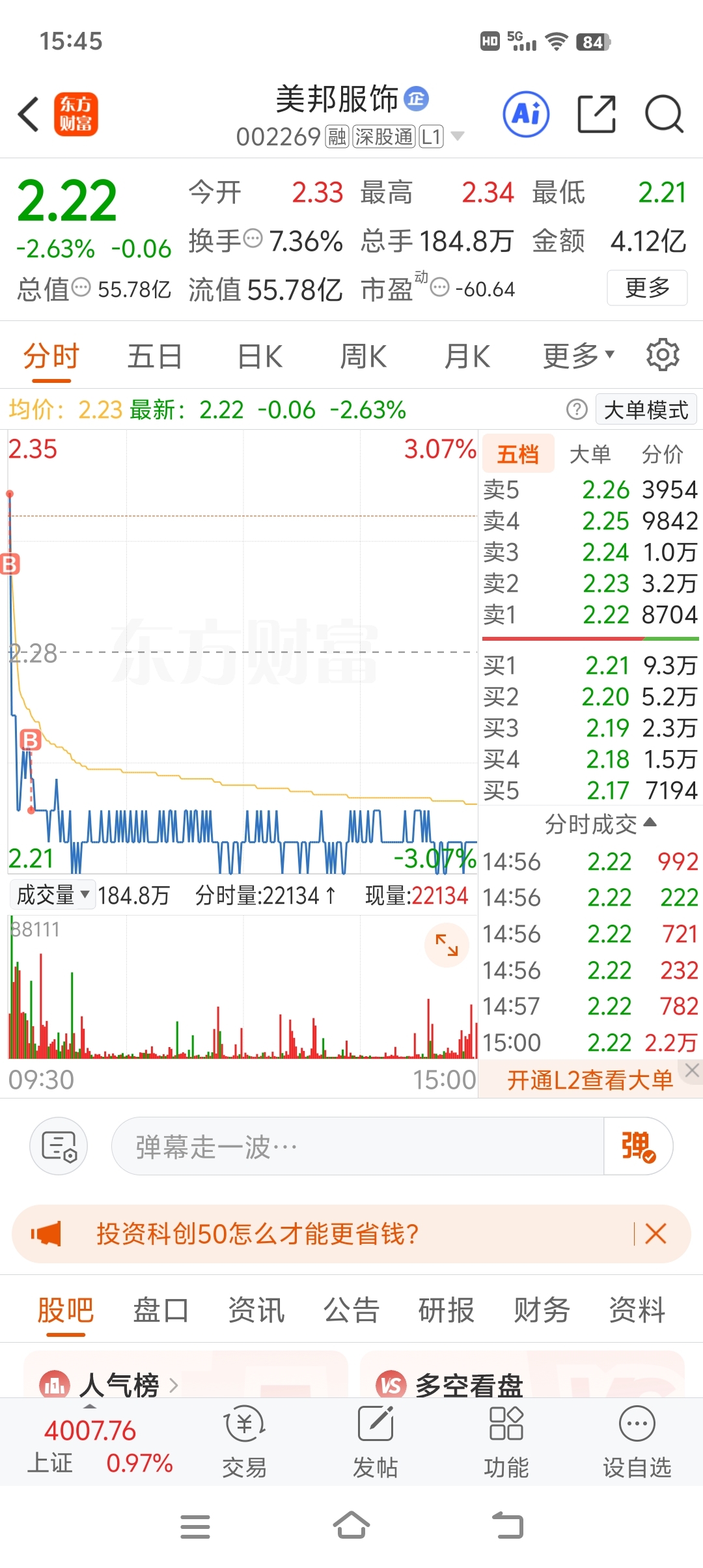 $美邦服饰(SZ002269)$ 开盘满仓梭哈的,把一看被套了,把另一个轻仓的也卖了补仓,现在好了满仓被套老实了!