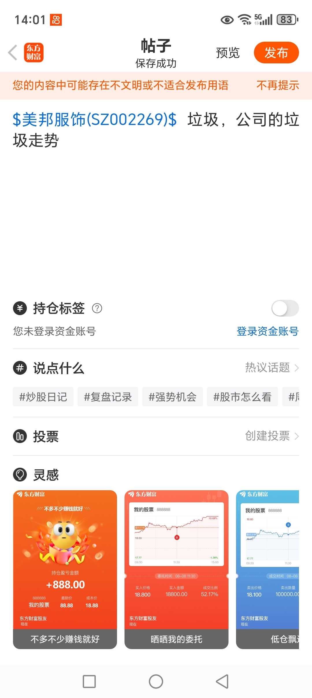 温馨提示: 1.根据《证券法》规定,禁止编造、传播虚假信息或者误导性信息,扰乱证券市场;2.用户在本社区发表的所有资料、言论等仅代表个人观点,与本网站立场无关,不对您构成任何投资建议。用户应基于自己的独立判断,自行决定证券投资并承担相应风险。《东方财富社区管理规定》