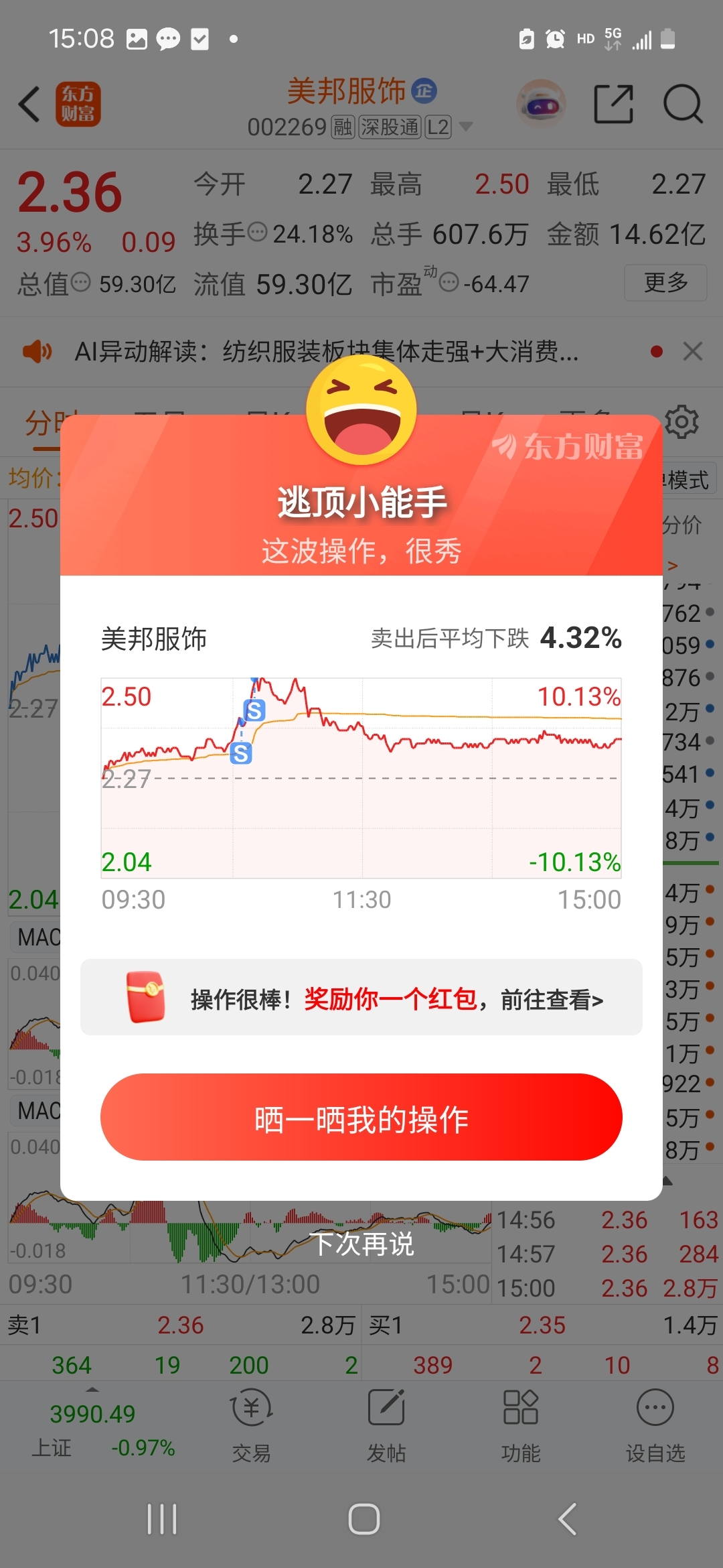 $美邦服饰(SZ002269)$ 昨天早盘2.21挂单加仓没成功,今天手动2.40卖单成交,隔夜单2.50涨停出了一半。