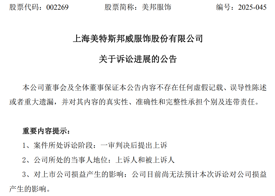 美邦服饰在公告中表示,目前二审受理及具体开庭时间尚未明确,诉讼结果尚存在不确定性,公司暂无法判断本次诉讼进展对公司本期或期后利润的影响。