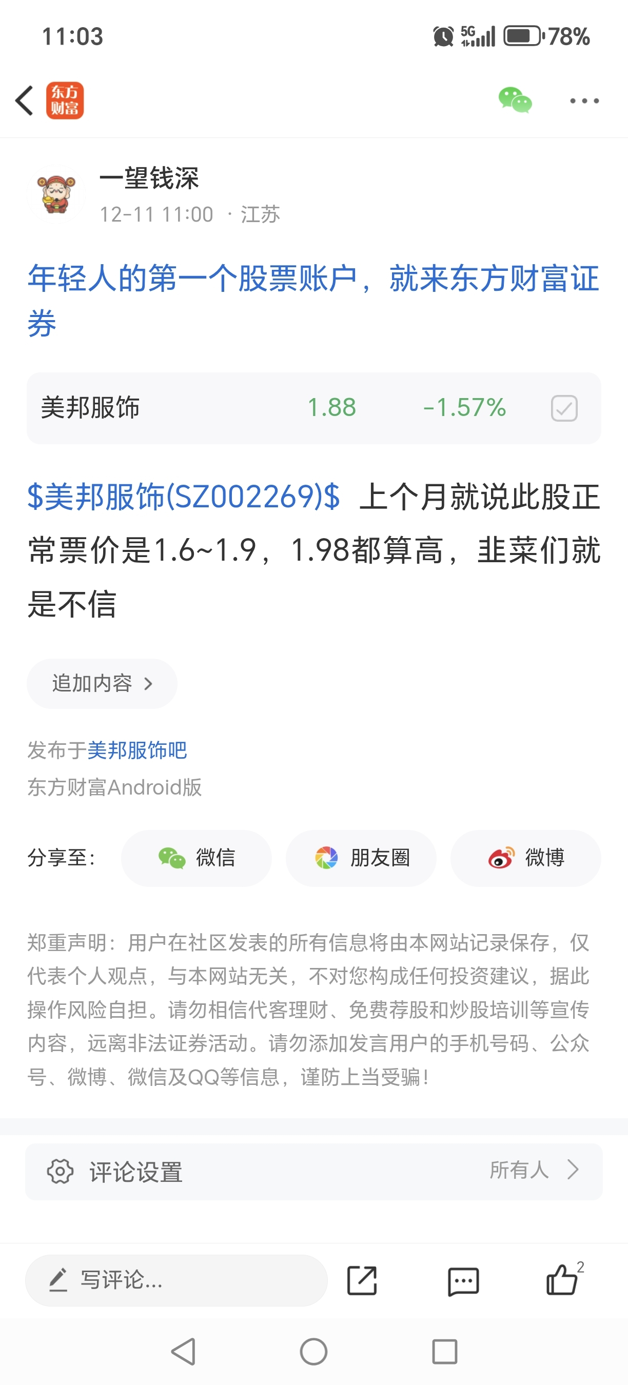 温馨提示: 1.根据《证券法》规定,禁止编造、传播虚假信息或者误导性信息,扰乱证券市场;2.用户在本社区发表的所有资料、言论等仅代表个人观点,与本网站立场无关,不对您构成任何投资建议。用户应基于自己的独立判断,自行决定证券投资并承担相应风险。《东方财富社区管理规定》