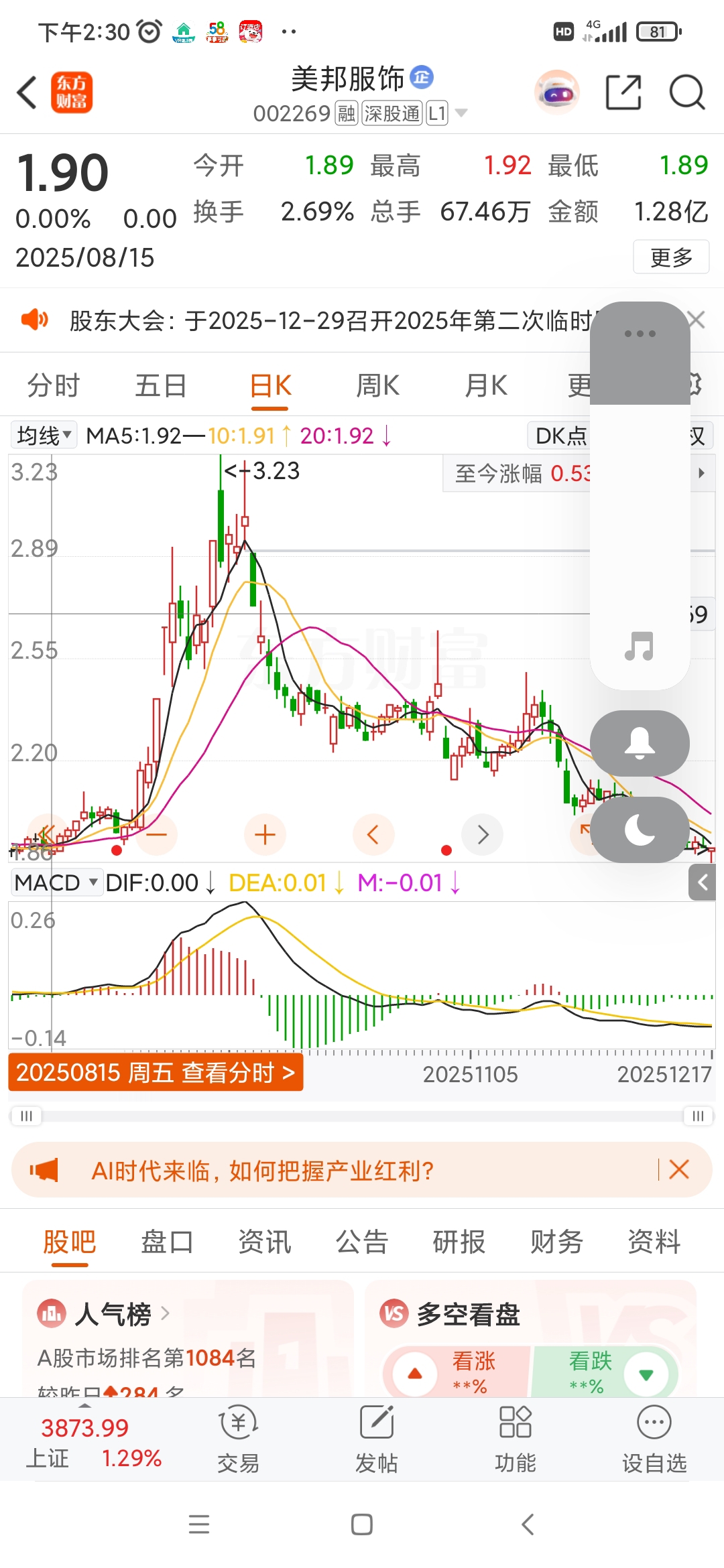 $美邦服饰(SZ002269)$ 天天跌, 跌破12日均线了…