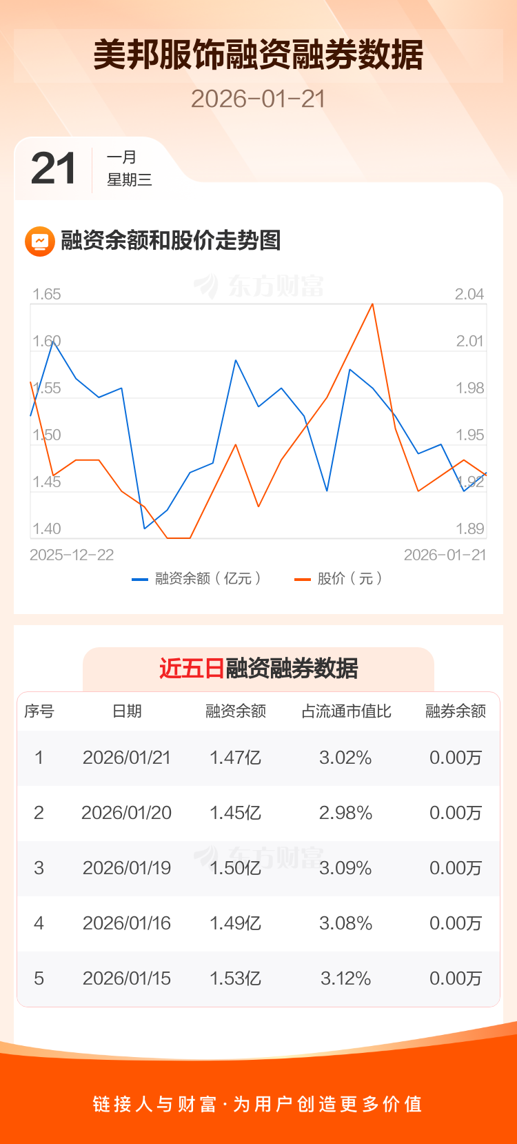 交易所最新数据显示,美邦服饰于2026年1月21日获融资买入798.71万元,融资偿还680.99万元,当日融资净买入117.72万元。目前,该股融资余额1.47亿,占流通市值比例为3.02%。
