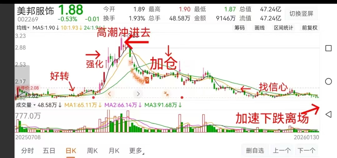$美邦服饰(SZ002269)$ (总是行情好转的时候不信,强化的时候犹豫,高的时候冲进去,回落的时候加仓,加速下跌的时候各种看基本面找信心,在下一次好转之前离场而去),各位,有没有跟这张图片上标注的一样啊?