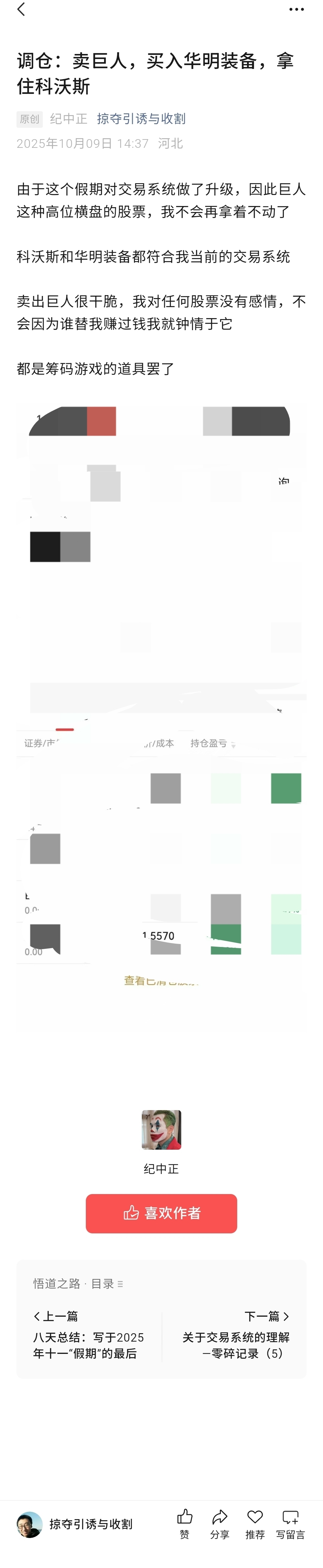 【实盘记录】2025年10月9日周四调仓:卖出巨人网络,买入华明装备,拿住科沃斯
