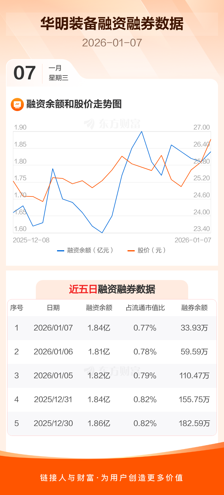 交易所最新数据显示,华明装备于2026年1月7日获融资买入3063.63万元,融资偿还2748.72万元,当日融资净买入314.91万元。目前,该股融资余额1.84亿,占流通市值比例为0.77%。