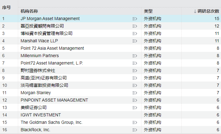 外资调研动向往往被视为市场的“风向标”。Wind数据显示,2026年以来截至2月4日,外资机构合计调研A股上市公司503次。其中,摩根资产管理调研15次,排名首位。在调研名单中,还出现了Point72资产管理公司、贝莱德、高盛、摩根士丹利、美银证券等外资巨头。
