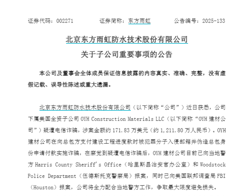 12月23日晚间,东方雨虹发布公告称,公司近日获悉,下属美国全资子公司OYH建材公司疑遭电信诈骗,涉案金额约171.83万美元(约1211.80万元人民币)。