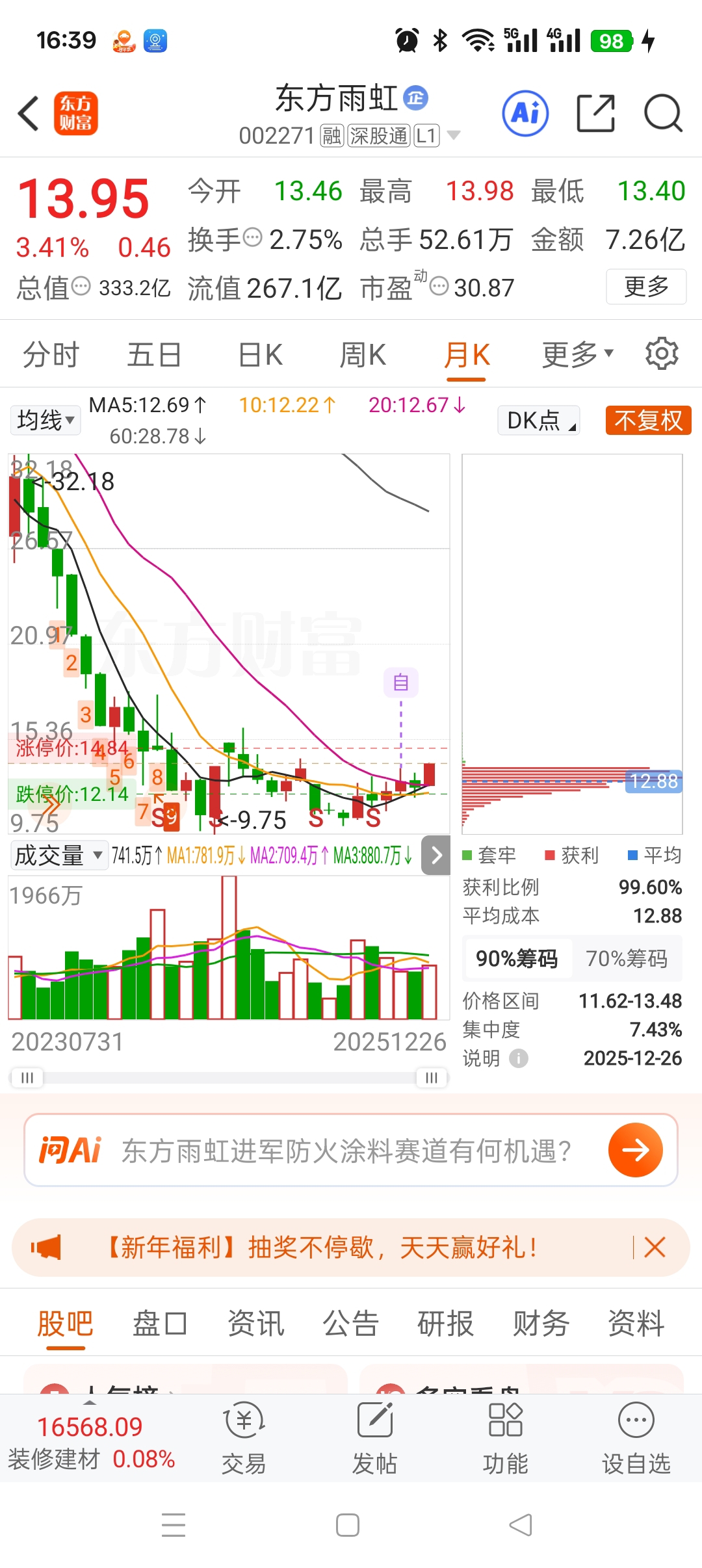 $东方雨虹(SZ002271)$ 筹码分布图,没有套牢了,随便你了
