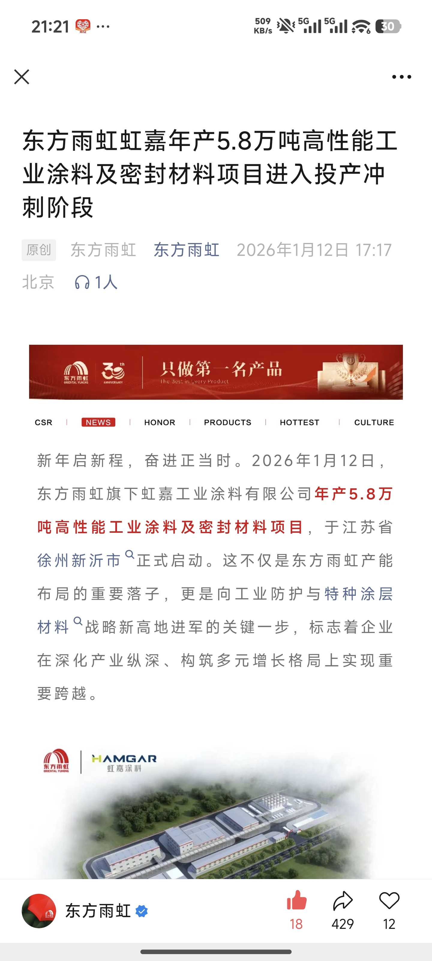 $东方雨虹(SZ002271)$ 东方雨虹虹嘉年产5.8万吨高性能工业涂料及密封材料项目进入投产冲刺阶段,或可带来营收增量50亿以上。