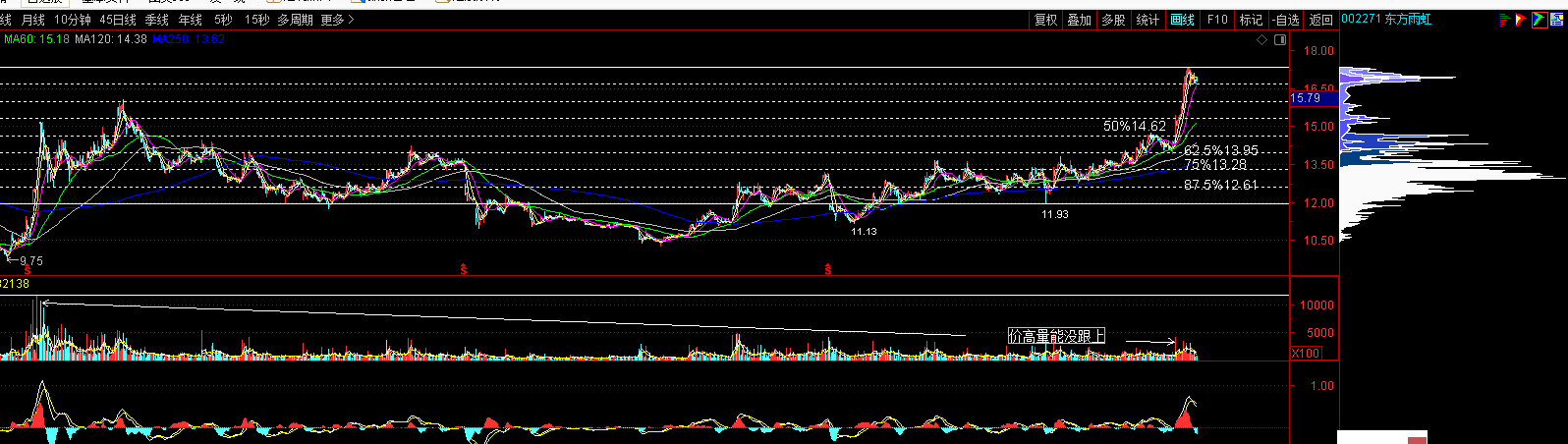 雨虹-涨势价高量能不足-大概率回头(暂时)可以考虑减点仓位。60分钟加码参看图: