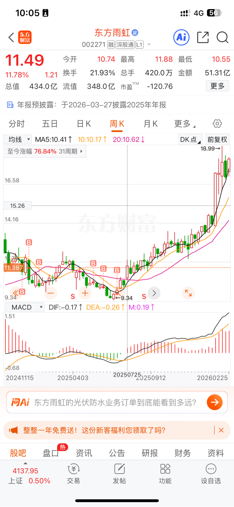 $东方雨虹(SZ002271)$ 让我们嗨起来好么