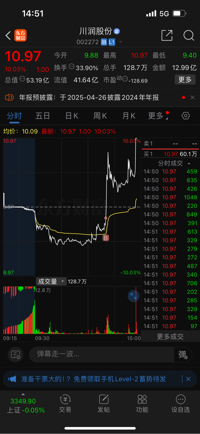 $川润股份(SZ002272)$ 早上水下5个点的时候一直在犹豫,眼睁睁看着一点一点拉升,最后实在忍不住了