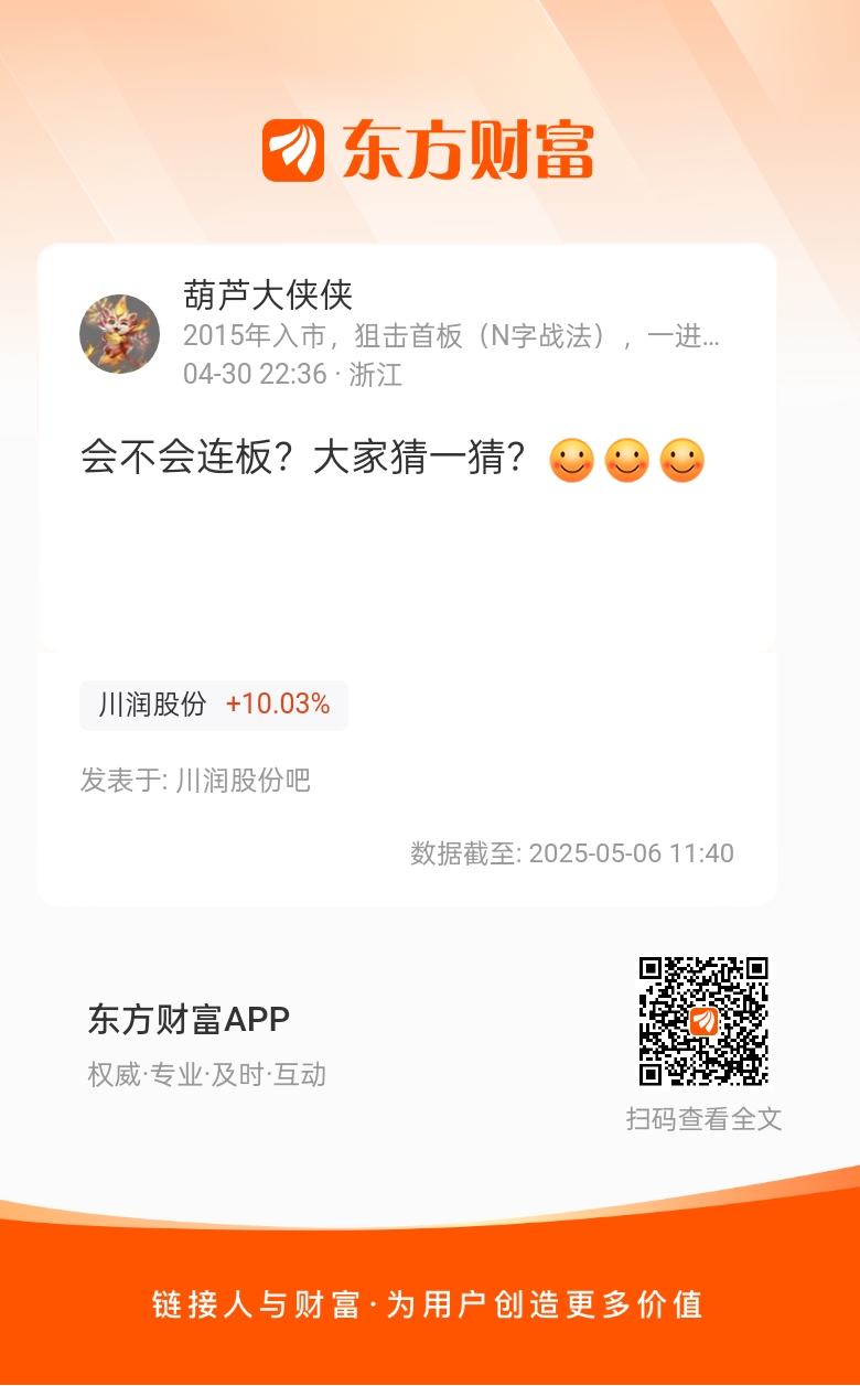 温馨提示: 1.根据《证券法》规定,禁止编造、传播虚假信息或者误导性信息,扰乱证券市场;2.用户在本社区发表的所有资料、言论等仅代表个人观点,与本网站立场无关,不对您构成任何投资建议。用户应基于自己的独立判断,自行决定证券投资并承担相应风险。《东方财富社区管理规定》