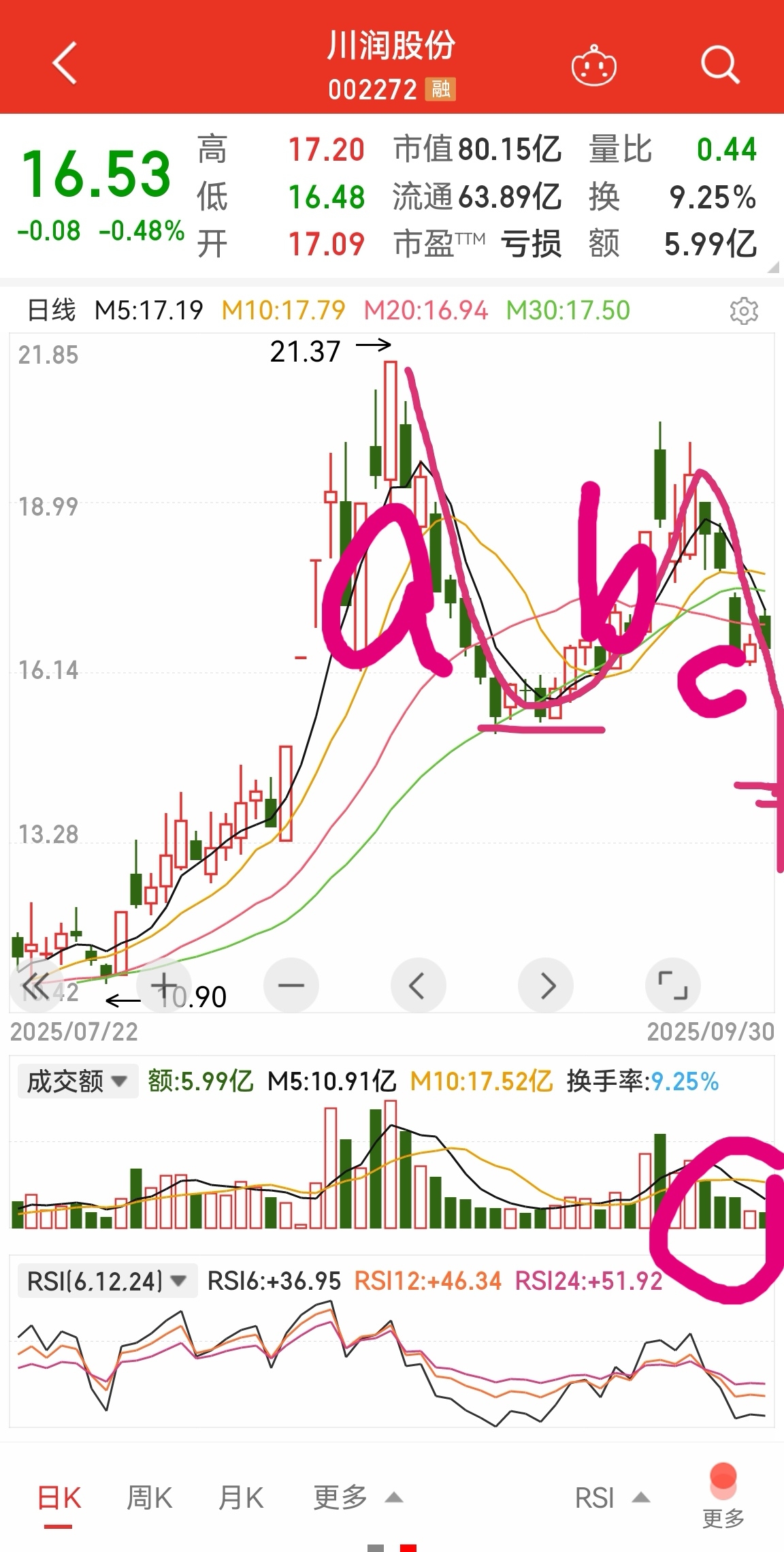 $川润股份(SZ002272)$ 虽然没有到买点,价格大概在14元左右可以买入,下跌abc 还差点火候还得跌,c点末端必须低于a点末端且缩量,现在量缩了但是价格还没到,少买点观察一下,一定不要着急