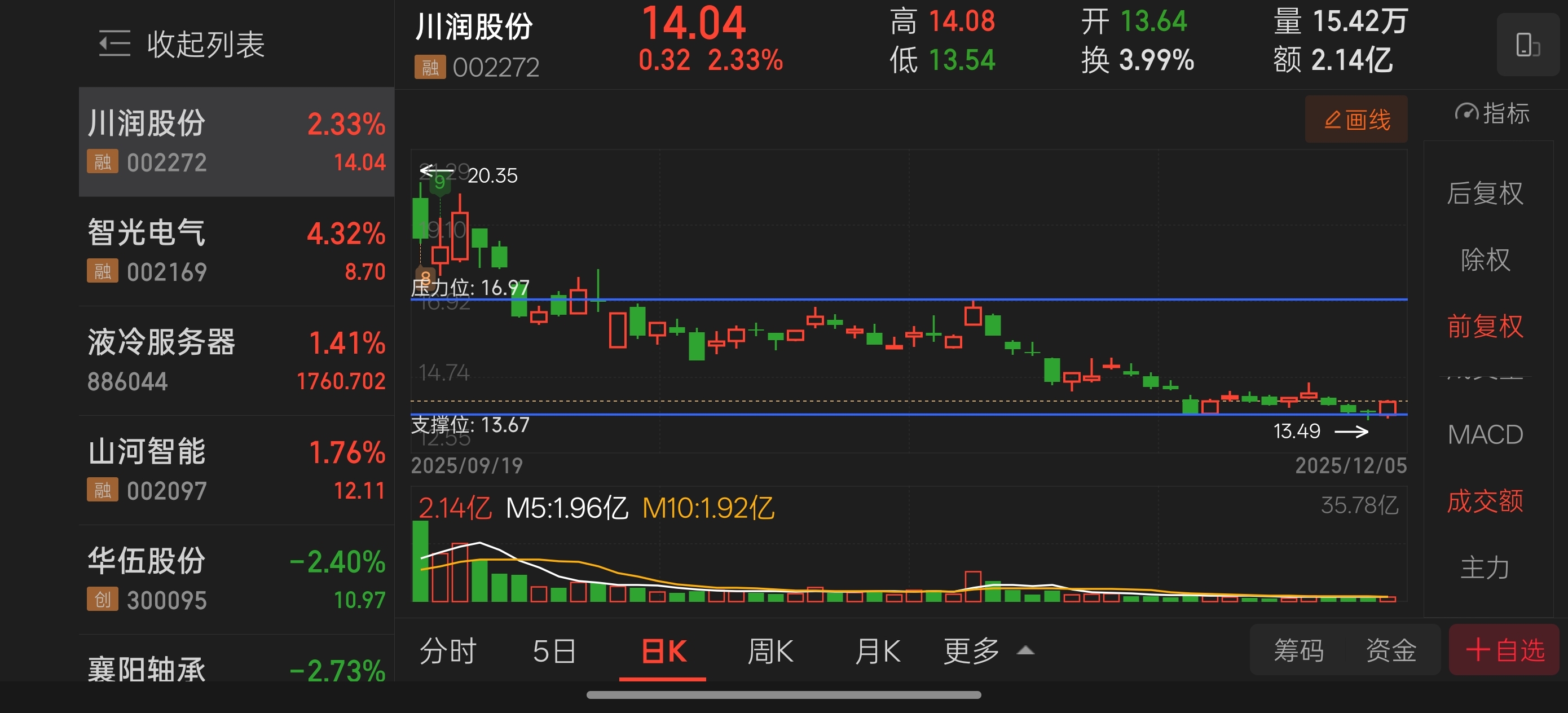 $川润股份(SZ002272)$ 短期支撑13.67!撑住了吧。止跌了。